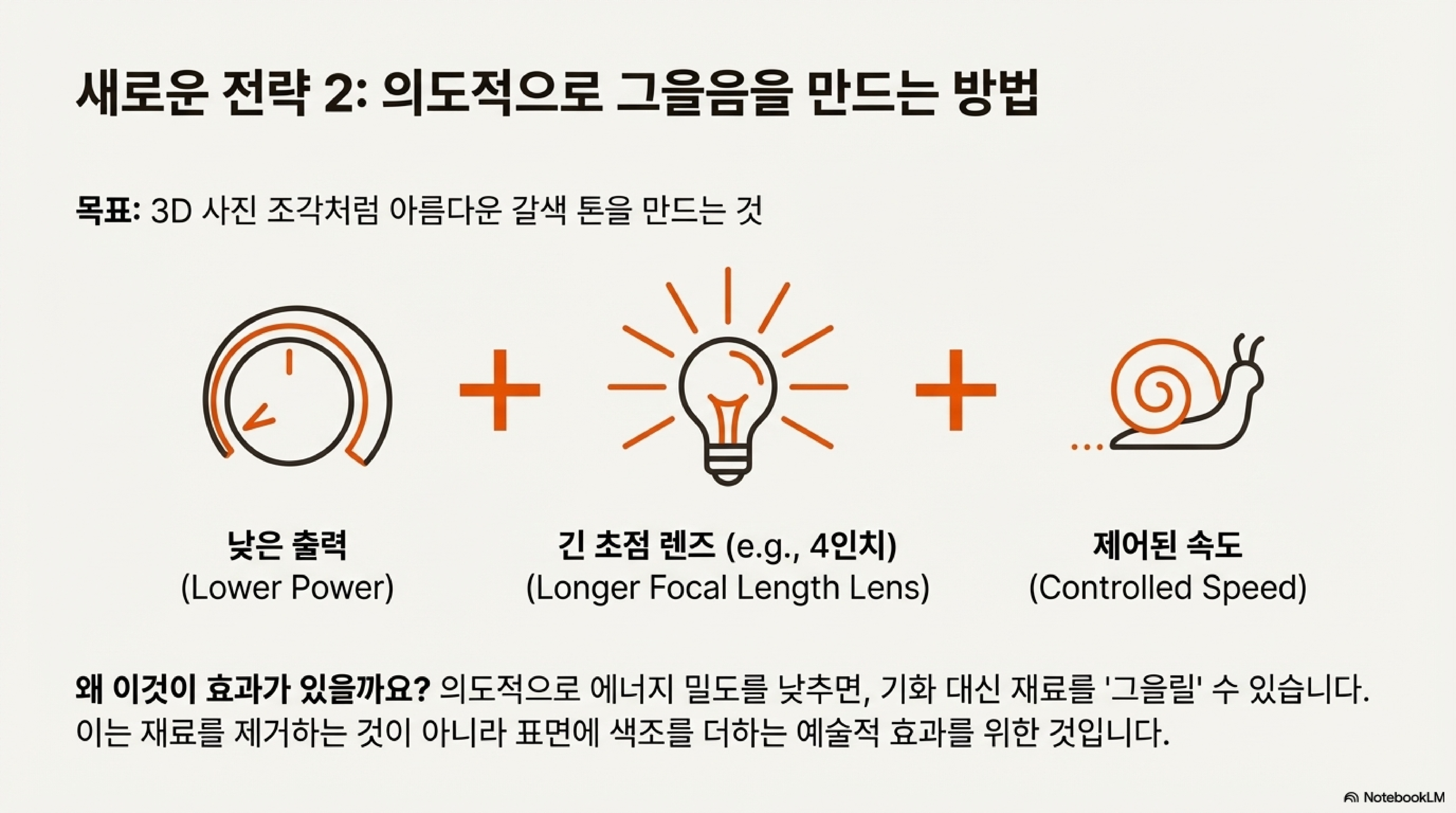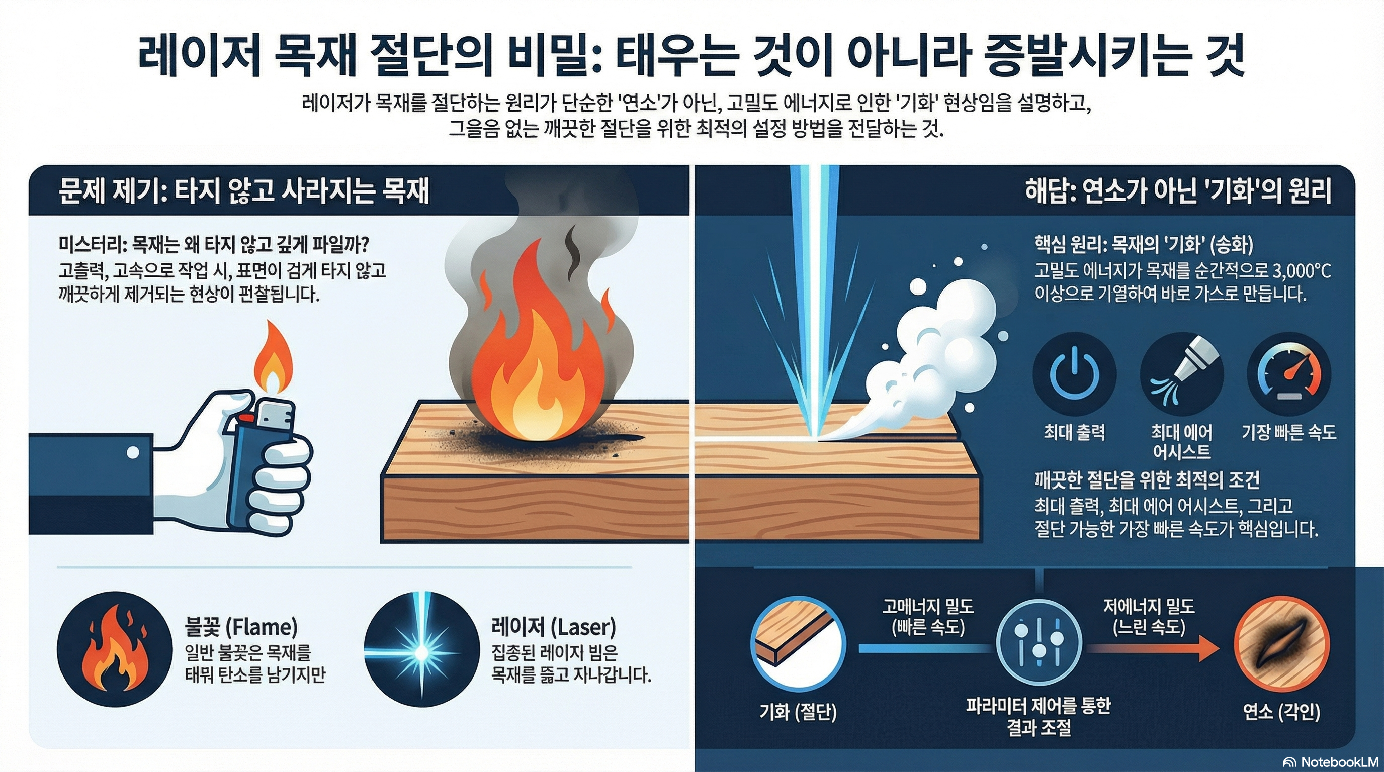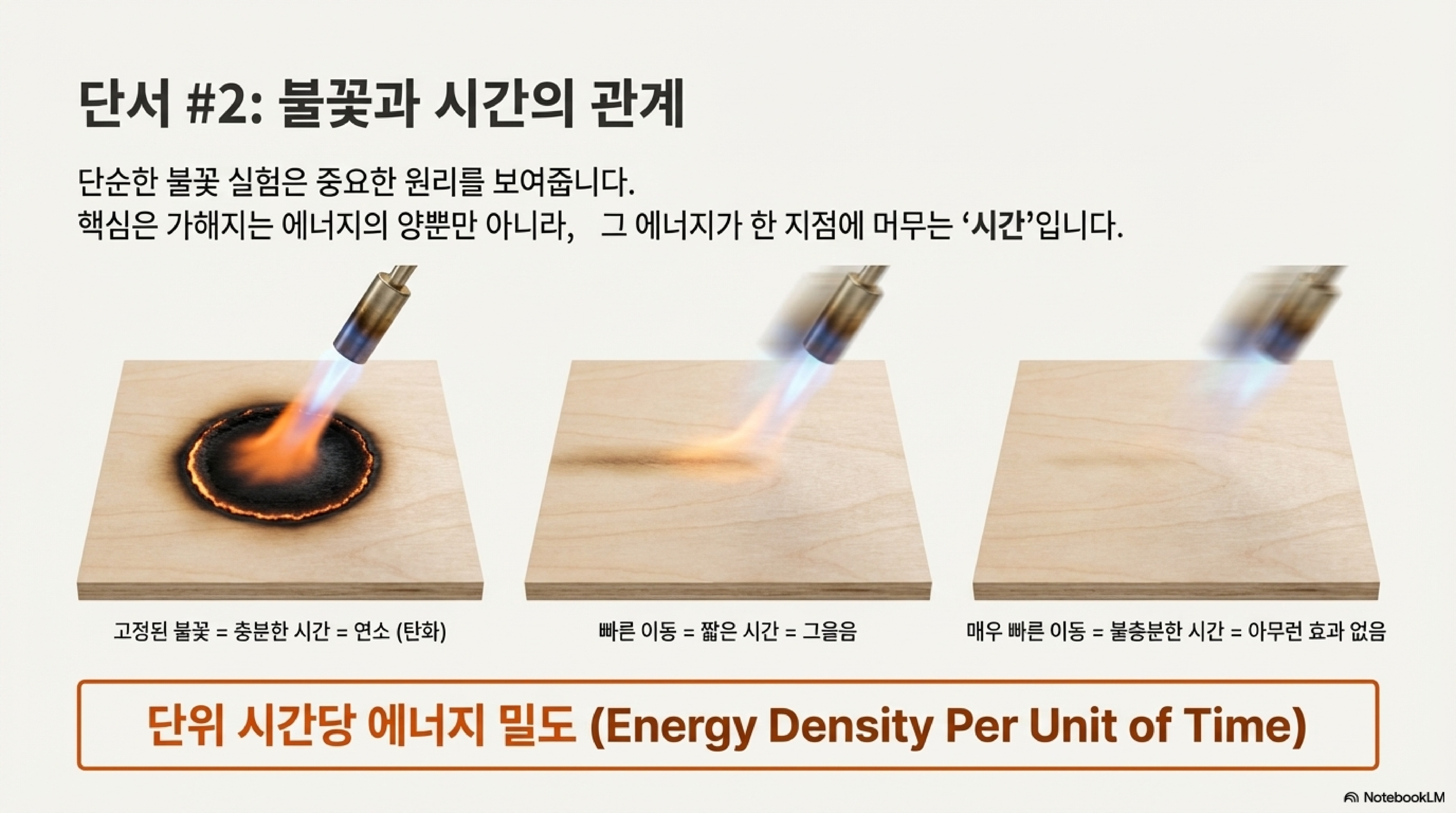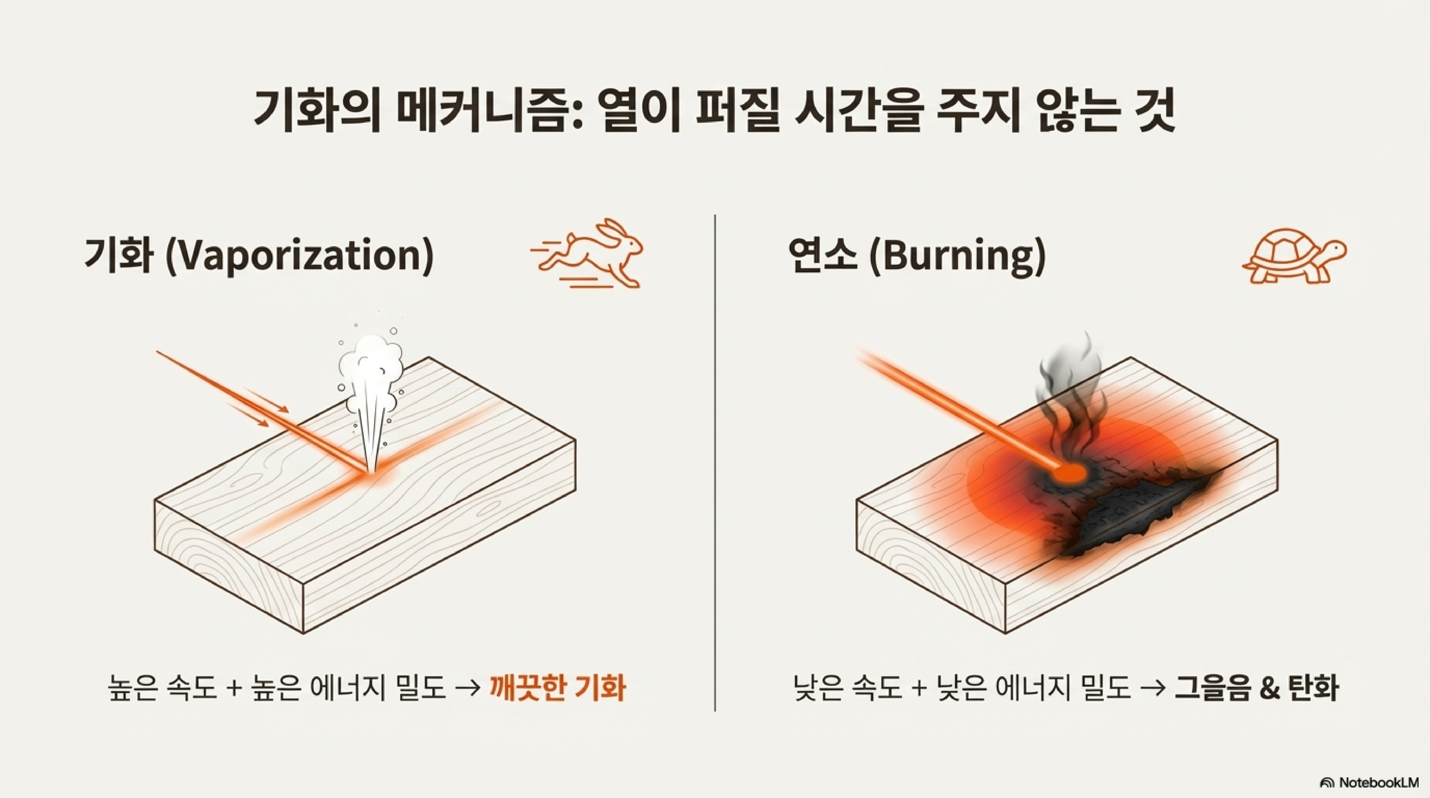 레이저를 빠른 속도로 움직이면, 에너지가 낮은 후광이 한 지점에 머무는 시간이 극도로 짧아져 나무를 태울 시간을 주지 않습니다. 기화 과정이 워낙 순식간에 일어나기 때문에, 연소 과정이 따라잡지 못하고 뒤에 남게 되는 것입니다. 이는 마치 토치 불꽃을 나무에 가만히 대고 있으면 타지만, 표면 위로 빠르게 움직이면 타는 효과가 사라지는 것과 같은 원리입니다.