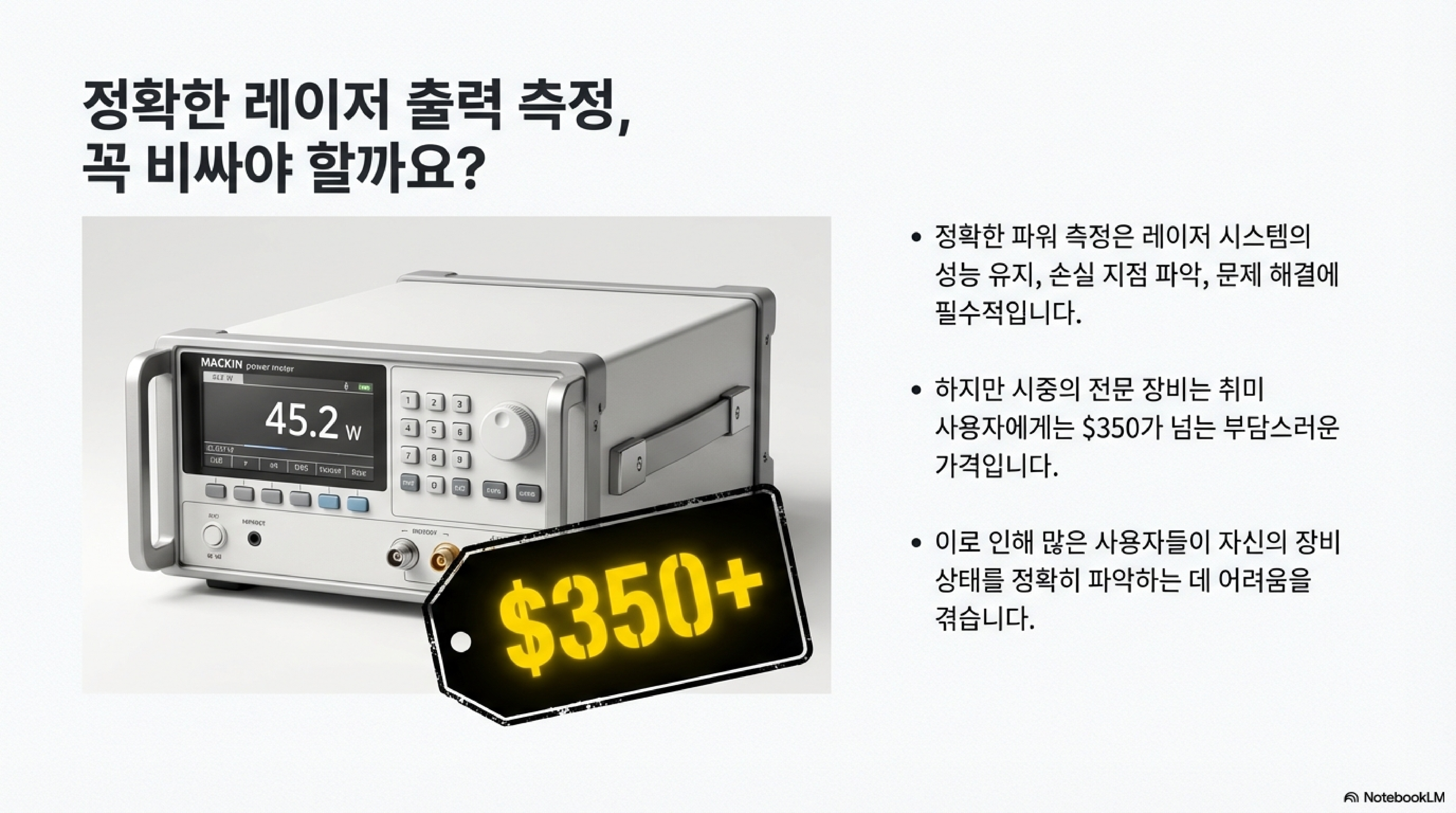 취미로 무언가를 만드는 분이라면 누구나 공감할 문제가 있습니다. 바로 전문가용 장비의 엄청난 가격이죠. 예를 들어, 레이저 출력을 정밀하게 측정하는 매킨(Mackin) 파워미터의 가격은 350달러가 훌쩍 넘습니다. 취미 생활에 투자하기에는 분명 부담스러운 금액입니다.