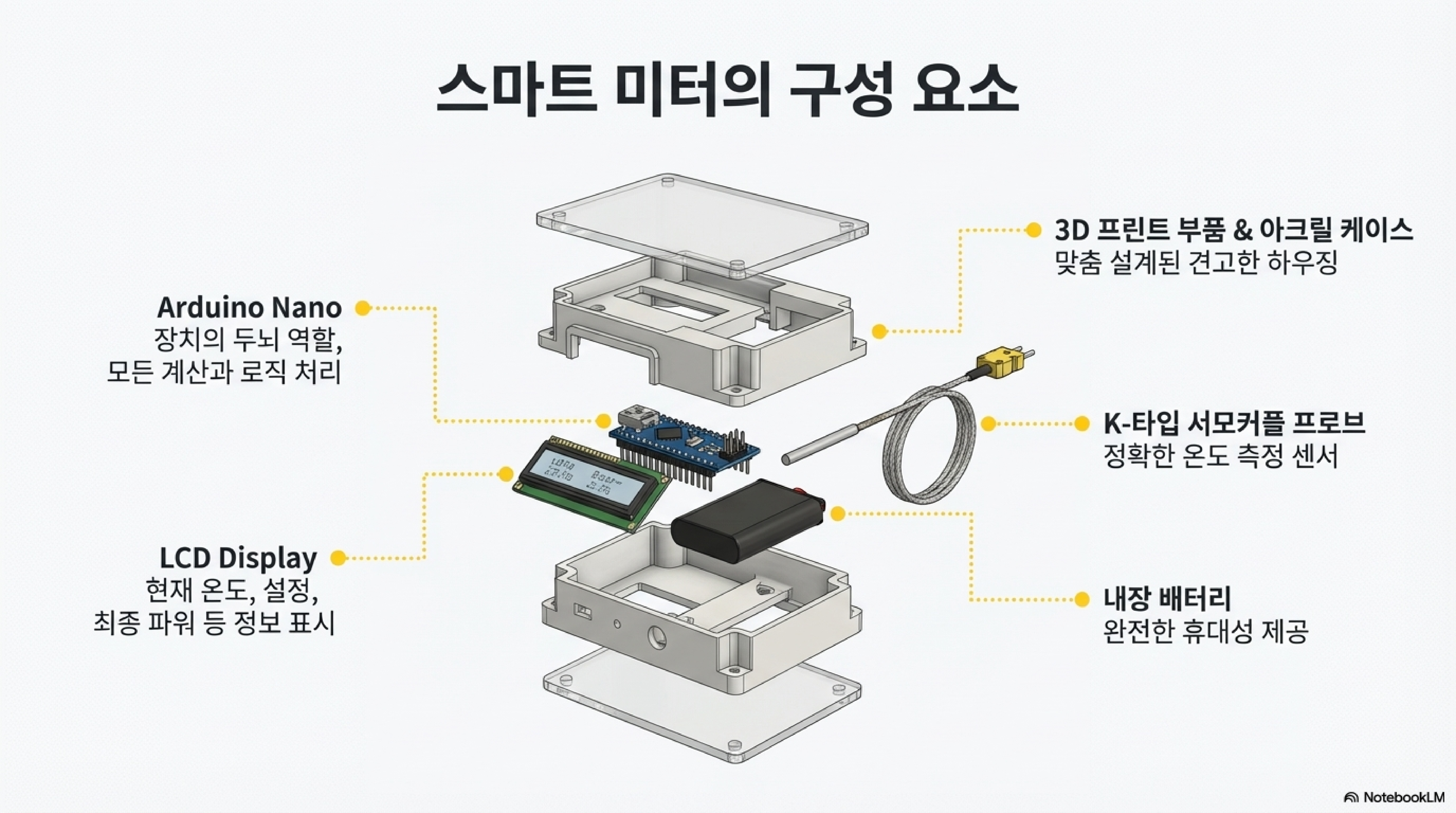- 아두이노, 배터리, 디스플레이가 맞춤 제작된 케이스 안에 모두 들어있습니다.