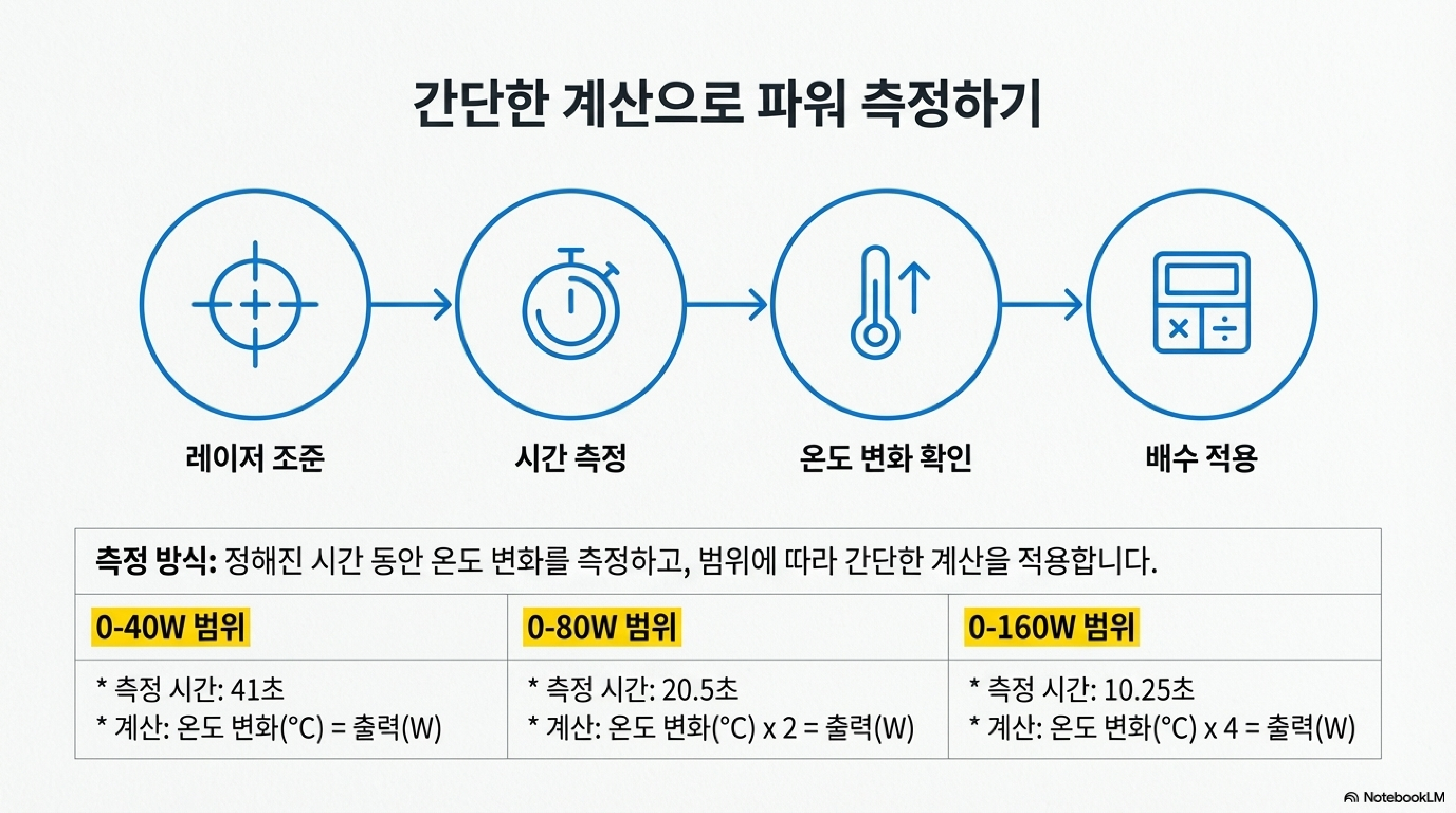- 0-160W 범위: 10.25초 동안 테스트를 진행한 후, 측정된 온도 상승 값에 4를 곱하면 와트(W) 값이 됩니다.