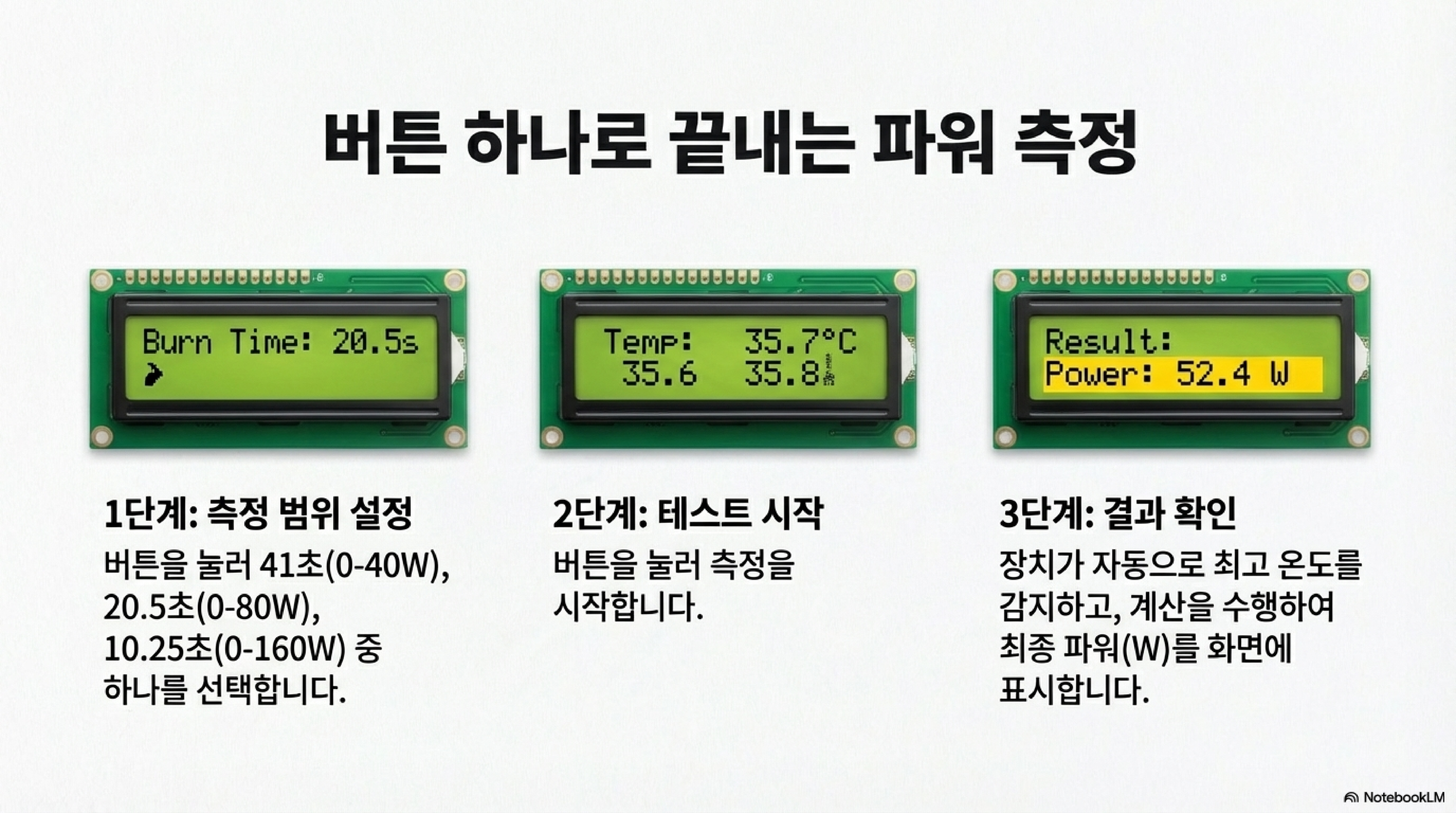 - 최고 온도를 자동으로 감지하고 최종 결과를 와트(W) 단위로 직접 표시합니다.