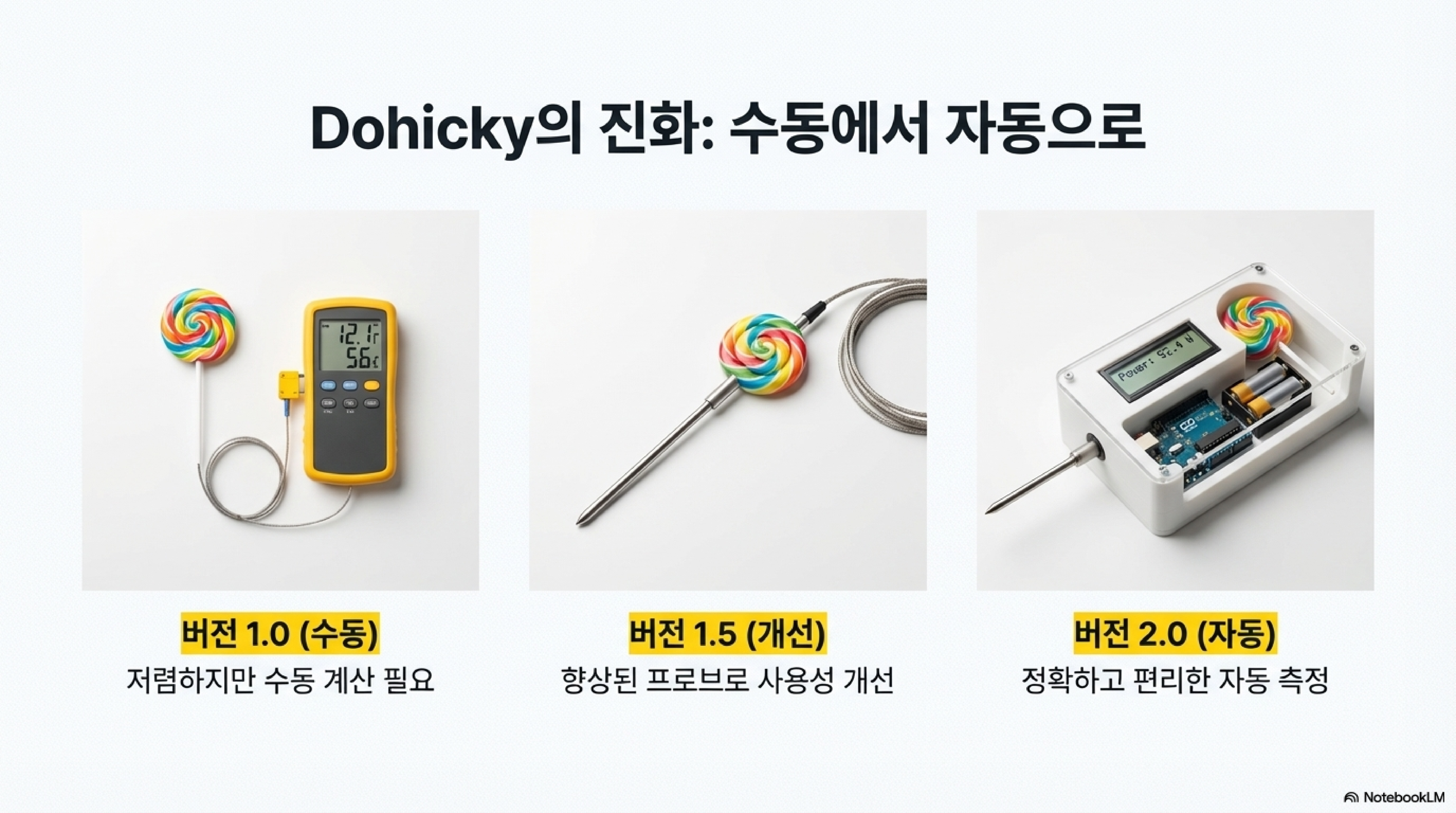 도히키 프로젝트의 시작은 아주 간단한 아이디어에서 비롯되었습니다. 바로 비싼 전문가용 장비의 대안을 만드는 것이었죠. 초기의 '도히키'는 흔한 디지털 온도계와 함께 작동하도록 설계된 단순한 '롤리팝' 모양의 측정 헤드였습니다.