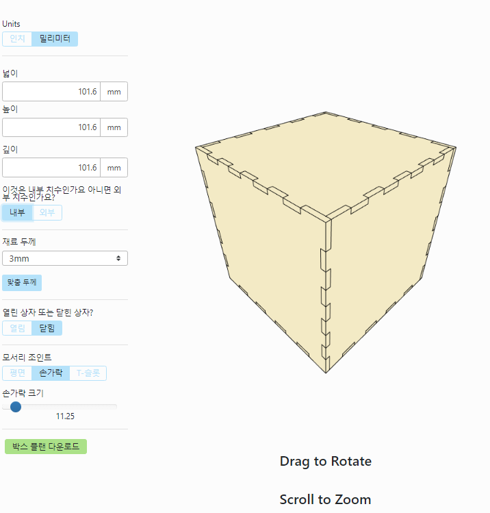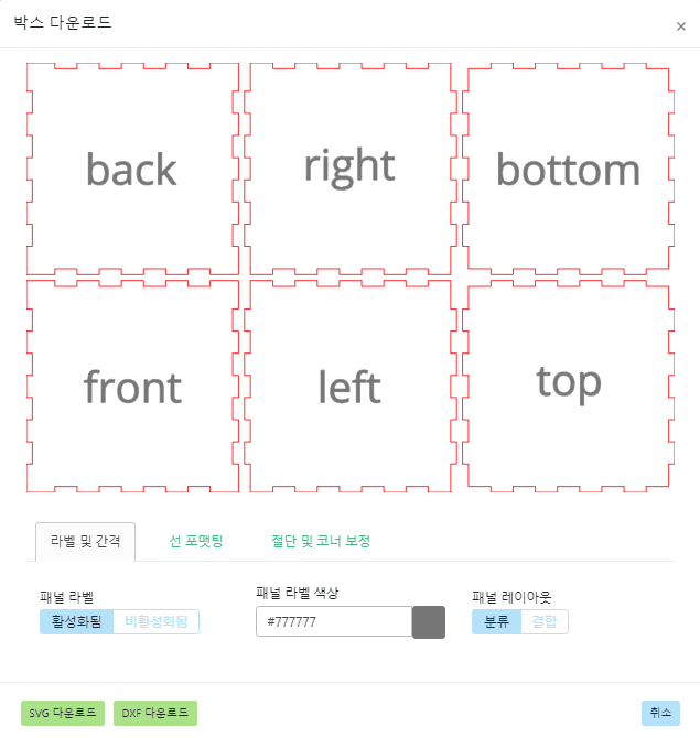 박스 플랜 다운로드를 클릭하여 DXF파일을 저장한다. RDWorks에서 DXF파일을 불러온다.