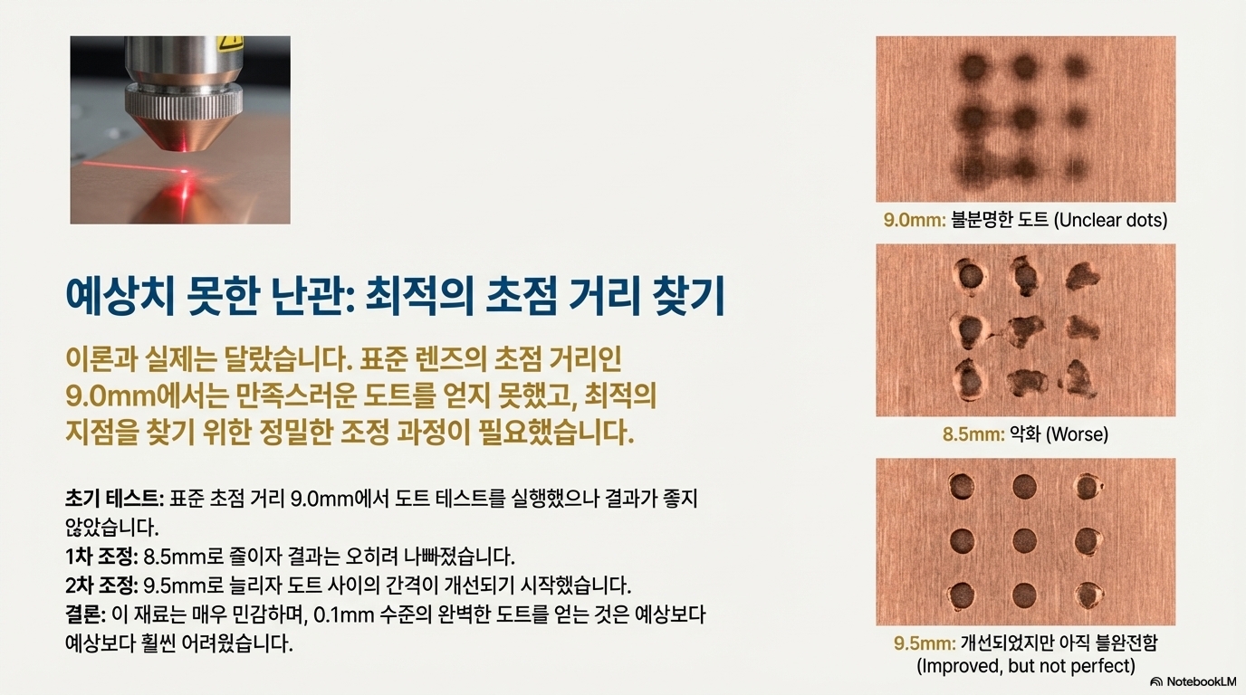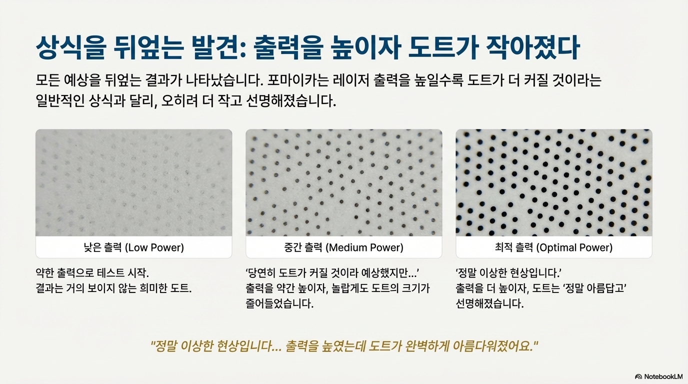 출력을 높일수록 각인된 점의 품질이 오히려 더 좋아졌고, 심지어 크기가 줄어드는 것처럼 보였습니다. 더 강한 에너지가 더 작고 정밀한 점을 만들어낸 것입니다.