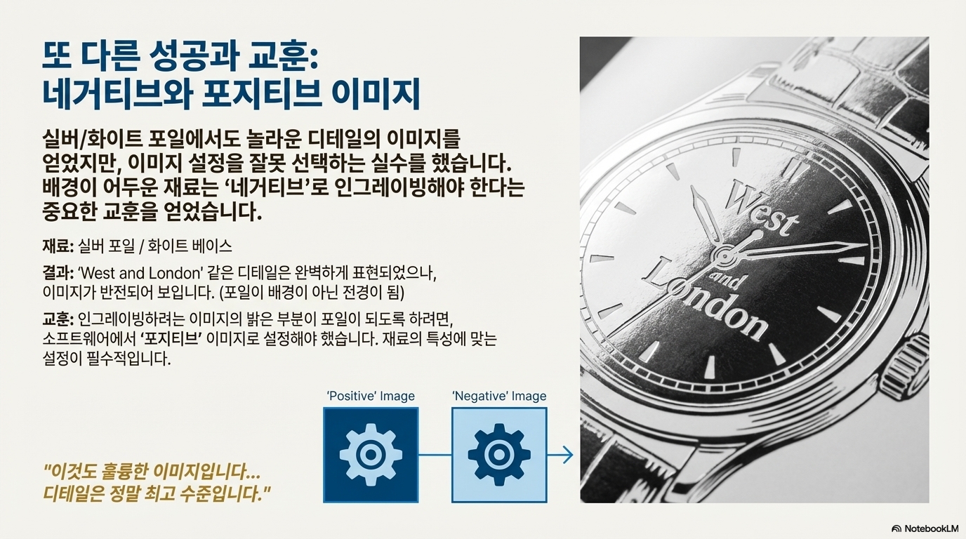 실제로 '은색과 흰색' 재료를 테스트했을 때 이 설정의 중요성이 명확히 드러났습니다. 결과물은 "훌륭한 이미지"였지만, 포지티브로 각인해야 할 것을 네거티브로 잘못 설정하는 바람에 의도와는 정반대의 결과가 나왔습니다. 재료의 특성에 맞춰 우리의 생각을 '반전'시켜야만 올바른 결과를 얻을 수 있음을 보여주는 완벽한 사례였죠.