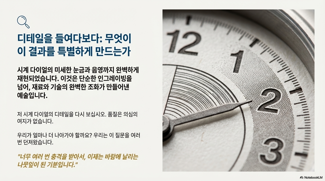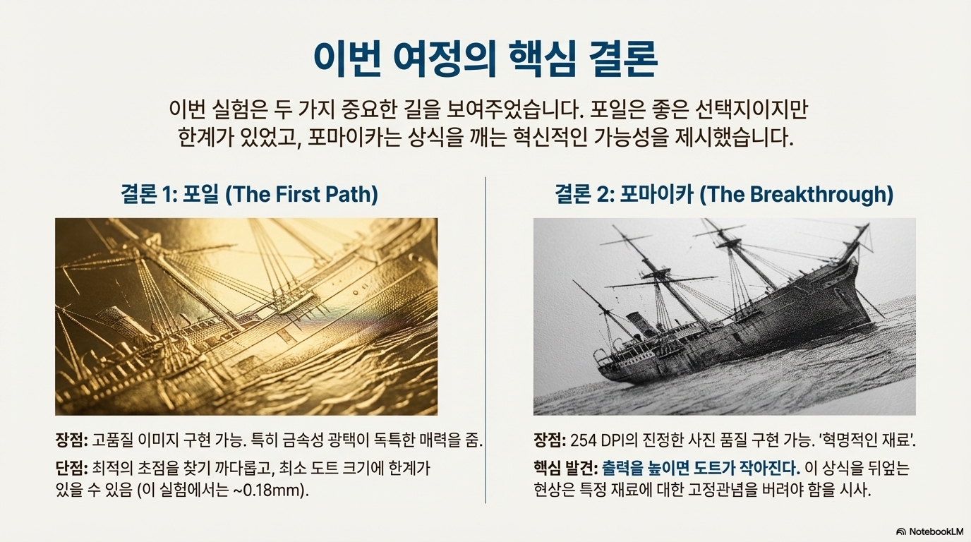 결국, 이번 여정은 완벽한 결과물이 재료(포마이카), 기술(역직관적 출력 조절), 논리(네거티브 사고), 그리고 정밀함(마이크로 초점 조정)이라는 네 가지 영역 모두에서 기존의 상식을 깨뜨릴 때 비로소 탄생한다는 것을 보여주었습니다. 혁신은 기존의 가정을 의심하고 끊임없이 실험하는 용기에서 비롯됩니다.