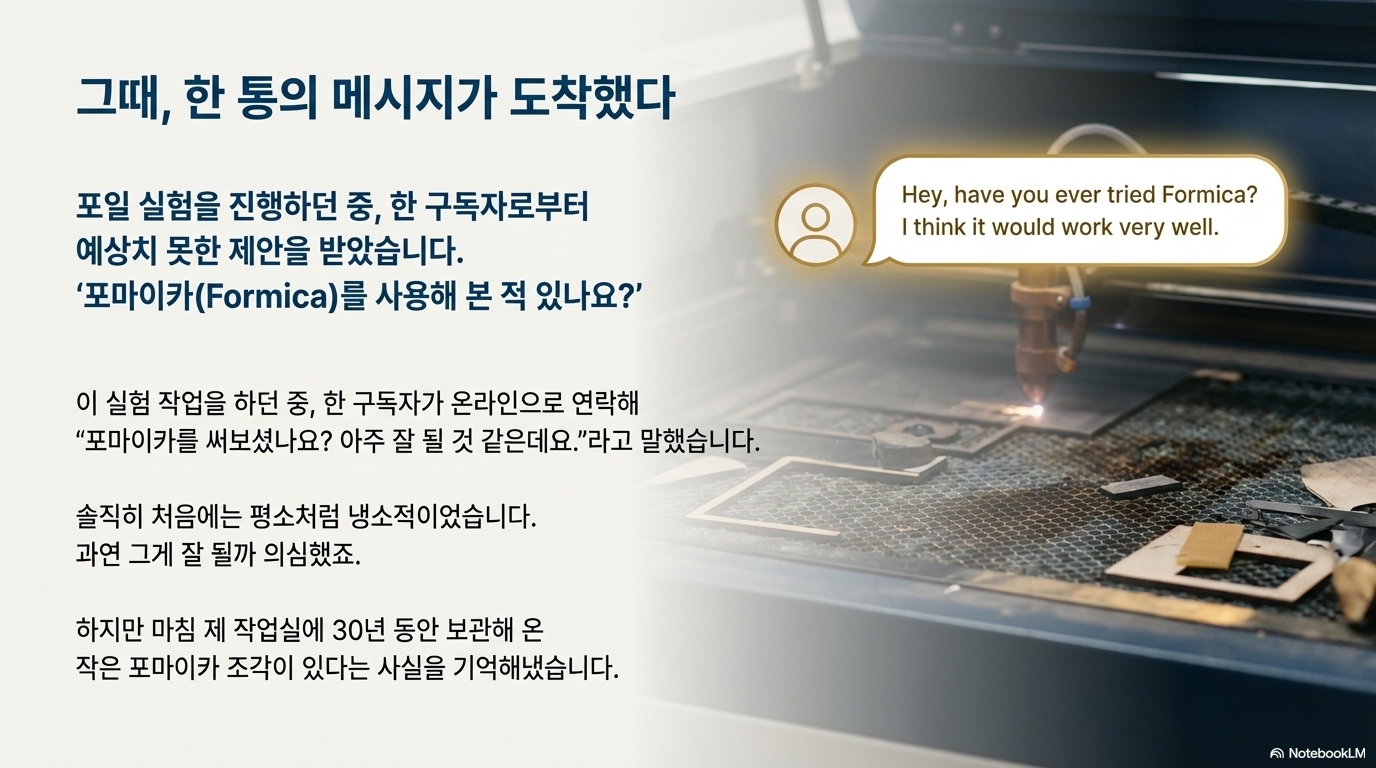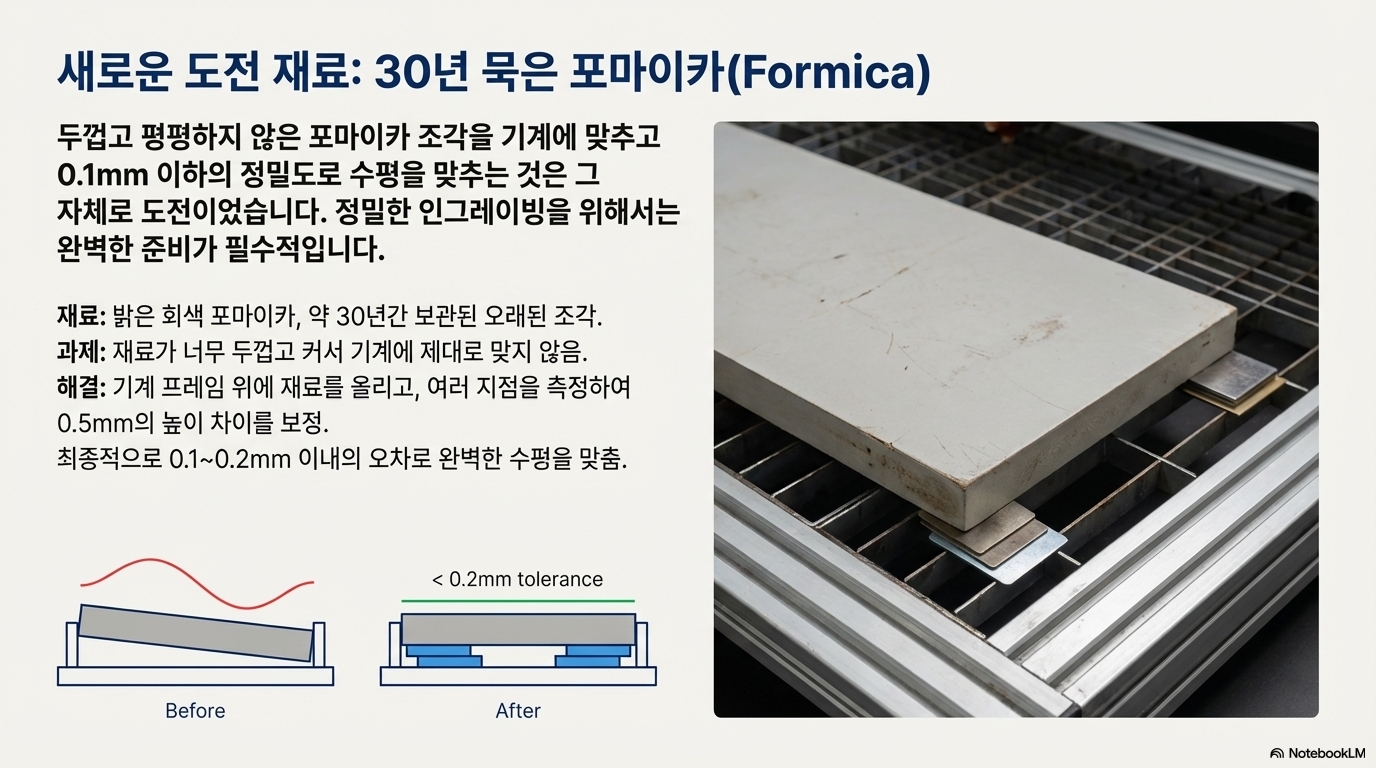 다양한 특수 재료를 테스트하던 중, 한 통신원으로부터 뜻밖의 제안을 받았습니다. 바로 '포마이카(Formica)'를 사용해 보라는 것이었습니다. 솔직히 처음에는 회의적이었습니다. 제 작업실에 지난 30년간 처박혀 있던 옅은 회색 포마이카 조각, 그저 평범한 주방 상판 마감재가 고정밀 사진 각인에 어울릴 리 없다고 생각했죠.