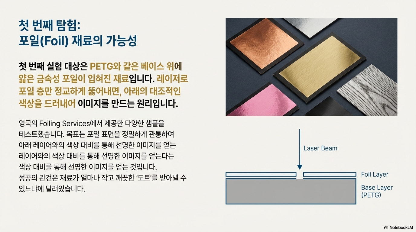 다음 실험 대상은 '검은색 배경 위의 구리'나 '검은색 위의 핑크색'처럼 얇은 금속 포일이 어두운 배경 위에 코팅된 재료들이었습니다. 이런 소재를 다룰 때 목표는 명확합니다. 상단의 포일 층(예: 금색)을 레이저로 정밀하게 제거하여 아래의 대조적인 배경색(예: 검은색)을 드러내는 것입니다. 즉, 최종 이미지는 포일이 제거된 검은색 부분으로 만들어집니다.