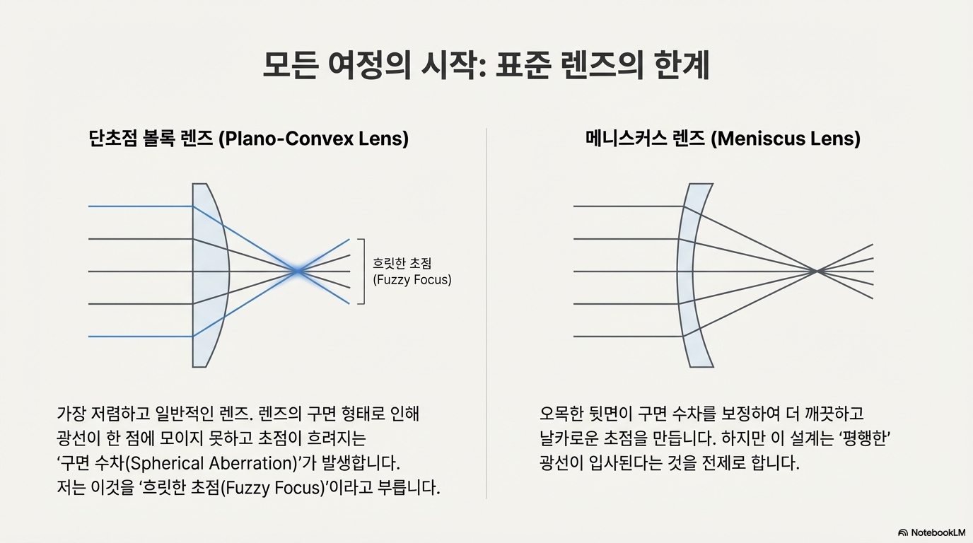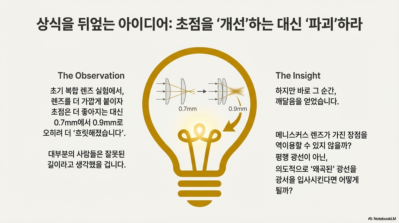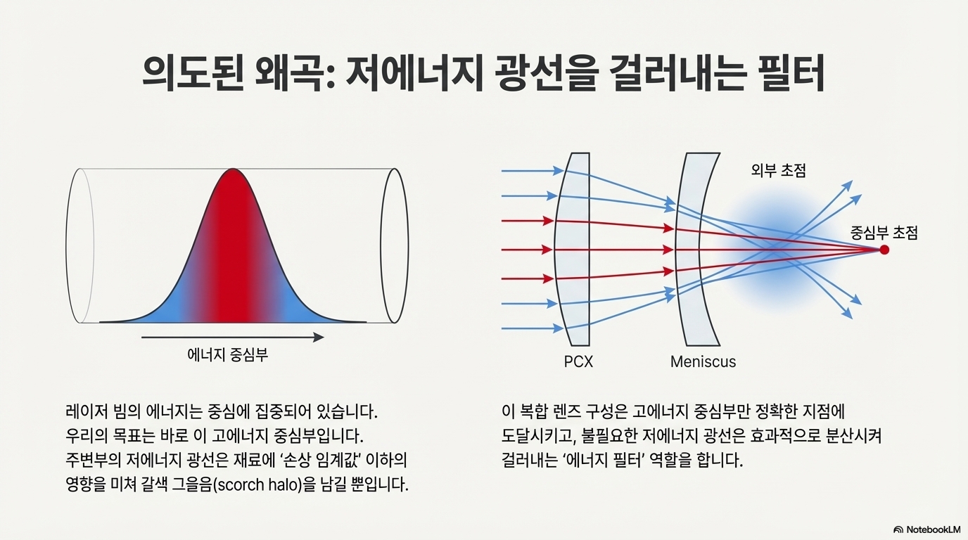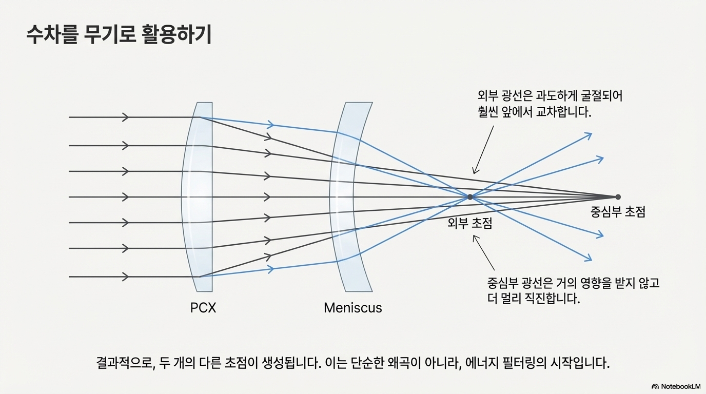 이것이 어떻게 더 좋은 결과를 낳았을까요? 원리는 '에너지 필터링'과 렌즈의 특성을 역이용하는 데 있습니다. 그가 사용한 메니스커스 렌즈는 평행 광선을 받아 구면 수차를 '보정'하도록 정교하게 설계된 렌즈입니다. 하지만 실험자는 첫 번째 렌즈를 통해 평행하지 않은 광선을 입력하여, 이 보정 기능을 의도적으로 '역이용'했습니다. 이상적인 작동 조건을 깨뜨리자 렌즈는 빔을 제어된 방식으로 왜곡시키는 도구가 되었습니다.