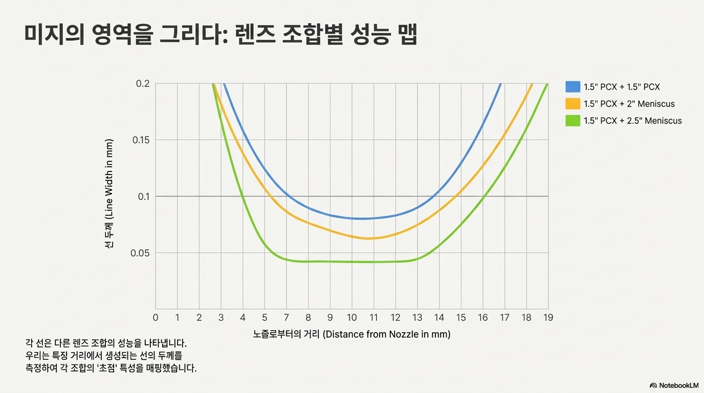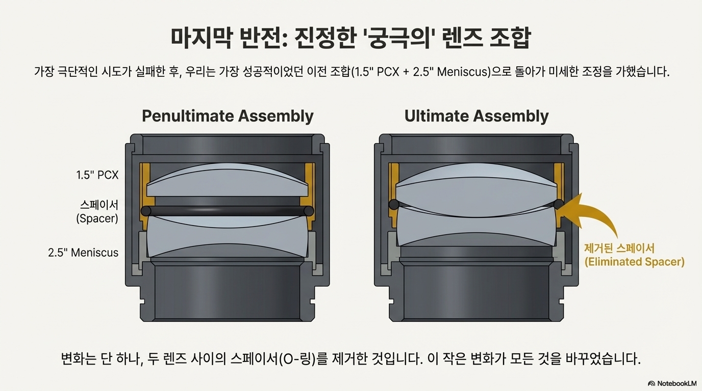 그것은 바로 두 렌즈의 조립 방식을 바꾸는 것이었습니다. 이전까지 렌즈와 렌즈 사이에 고무 O링 스페이서를 끼워 간격을 두었던 것을, 그 스페이서를 제거하고 두 렌즈를 "서로 바짝 붙이는 것"으로 바꾸었습니다. 이 미세한 물리적 변화가 빔의 특성을 극적으로 안정시켜, 이상적인 0.1mm 점을 탄생시켰습니다.