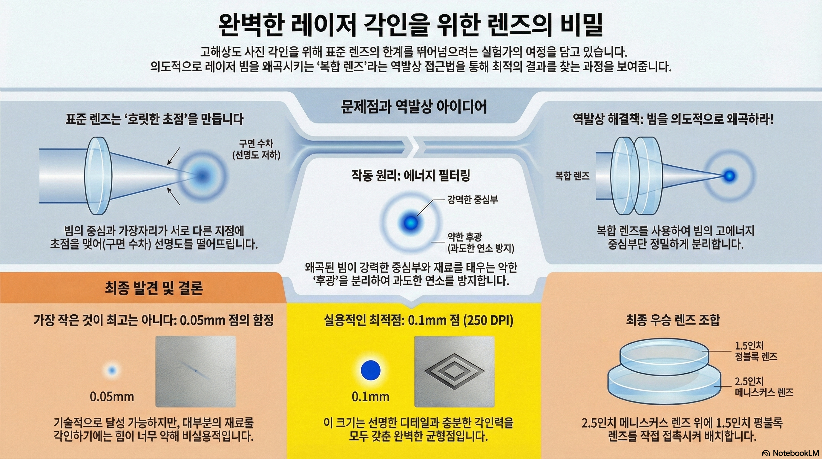 스마트폰 카메라의 메가픽셀 경쟁이나 모니터의 4K, 8K 해상도 전쟁을 보면 알 수 있듯이, 우리는 늘 '더 높은 사양'과 '더 작은 정밀도'에 집착합니다. 여기, 단 하나의 '완벽한 점'을 레이저로 찍어내기 위해 6개월이라는 시간을 바친 한 남자가 있습니다. 그에게 이 여정은 "내 인생의 골칫거리"였고, 스스로를 광학 전문가나 교사가 아닌, 그저 배우고 발견하는 '탐험가(Discoverer)'라고 부릅니다. 그의 여정은 단순히 더 작은 점을 향한 기술적 도전이 아니었습니다. 오히려 그 과정에서 그는 전문가들의 통념과 상식을 뒤엎는 놀라운 사실들을 발견하게 됩니다. 이 글은 그가 6개월간의 집요한 실험 끝에 얻어낸 다섯 가지 반직관적인 발견에 대한 이야기입니다.