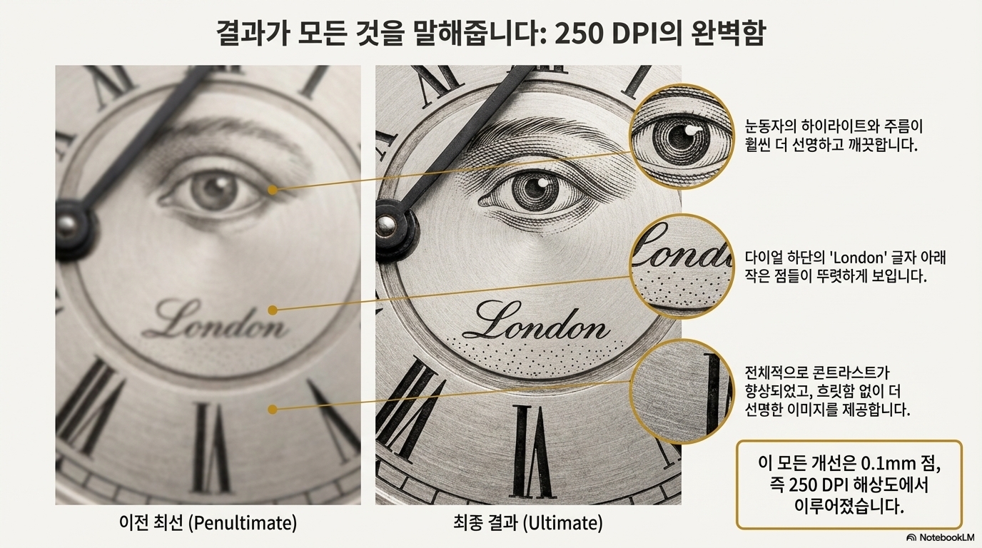 이 새로운 0.1mm 점으로 만든 최종 결과물은 이전의 어떤 것과도 비교할 수 없을 만큼 뛰어났습니다. 이미지는 "더 선명하고(crisper) 깨끗했으며(cleaner)", 이전에는 뭉개졌던 "눈가의 주름과 디테일", "눈동자의 하이라이트"가 뚜렷하게 살아났습니다. 심지어 "London이라는 단어 아래의 선명한 작은 점들"까지 완벽하게 구현되었습니다. 가장 작은 점이 아니라, 최적의 균형을 이룬 점이 최고의 결과를 만든 것입니다.