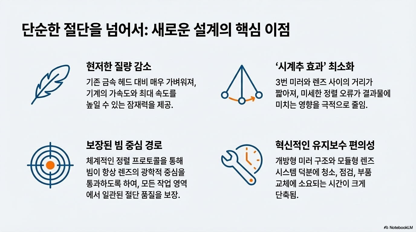 좋은 설계는 사용자의 유지보수 과정까지 고려해야 합니다. 이 레이저 헤드는 그 철학을 완벽하게 보여줍니다. 표준 헤드에서는 세 번째 거울이 깊숙이 숨겨져 있어 청소나 점검이 매우 어렵지만, 이 설계에서는 거울이 완전히 노출되어 있어 언제든 쉽게 닦고 상태를 확인할 수 있습니다.