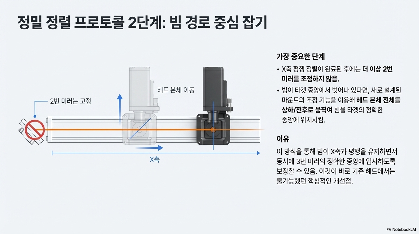 이 기능은 정렬 과정의 마지막 단계를 완성하는 핵심 열쇠입니다. 먼저 1번과 2번 거울을 통해 기계의 X축과 평행한 완벽한 빔 경로를 만듭니다. 그 다음, 이 헤드 조정 기능을 사용해 이미 정렬된 빔의 경로 안으로 '3번 거울이 장착된 헤드 자체'를 통째로 움직여 정확하게 위치시킵니다. 이로써 빔이 3번 거울의 중심에 정확히 맞고, 렌즈의 중심축을 따라 완벽하게 수직으로 내려가도록 보장할 수 있습니다.