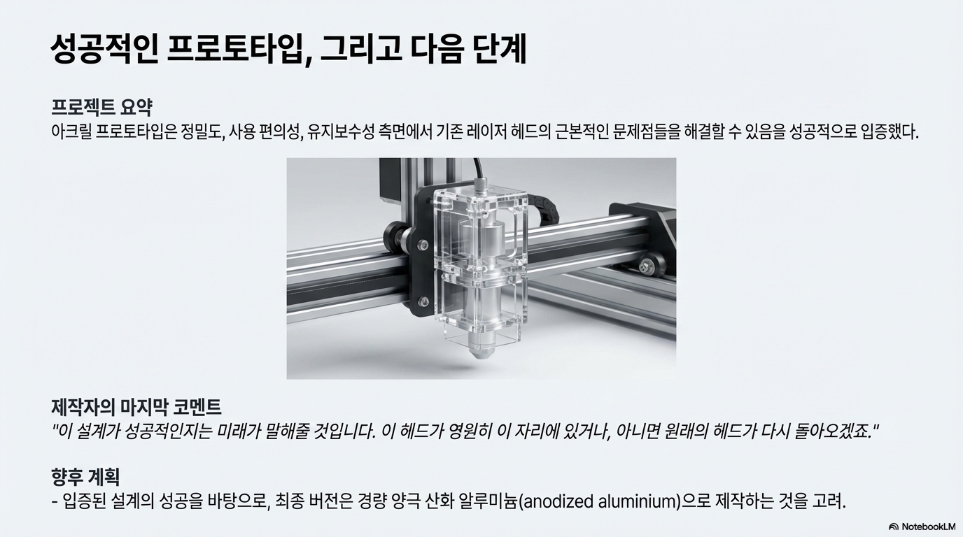 이 DIY 레이저 헤드 프로젝트는 영리한 문제 해결, 철저한 사용자 중심의 설계 철학, 그리고 파격적인 재료를 활용한 신속한 프로토타이핑의 힘을 명확히 보여줍니다. 기존의 불편함을 당연하게 여기지 않고 '더 나은 방법'을 고민한 결과물이 얼마나 뛰어날 수 있는지를 증명한 훌륭한 사례입니다.