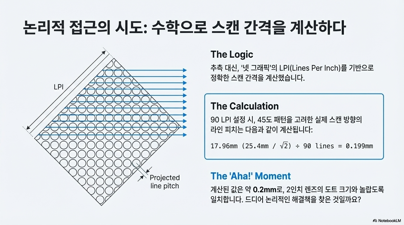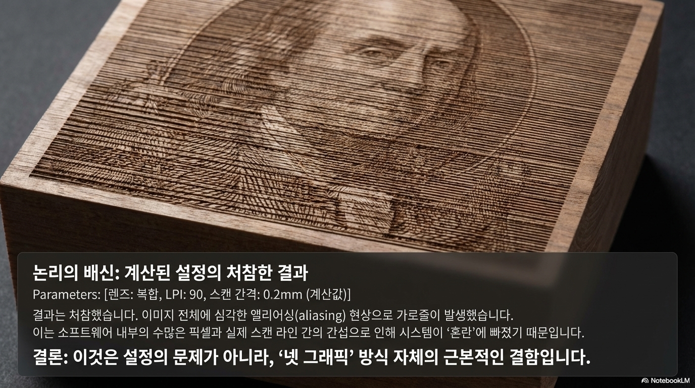 이 실패는 전통적인 '닷 디더(dot dither)' 방식과 극명한 대조를 이룹니다. 분석가는 0.1mm의 라인 간격을 가진 특수 렌즈의 물리적 특성에 맞춰 해상도를 254 DPI(25.4mm / 0.1mm = 254)로 설정하여 테스트했습니다. 결과는 훨씬 예측 가능하고 신뢰할 수 있었습니다. 이는 물리적 현실에 기반한 논리적 접근이 임의의 높은 숫자를 내세우는 마케팅보다 우월하다는 것을 증명합니다.
