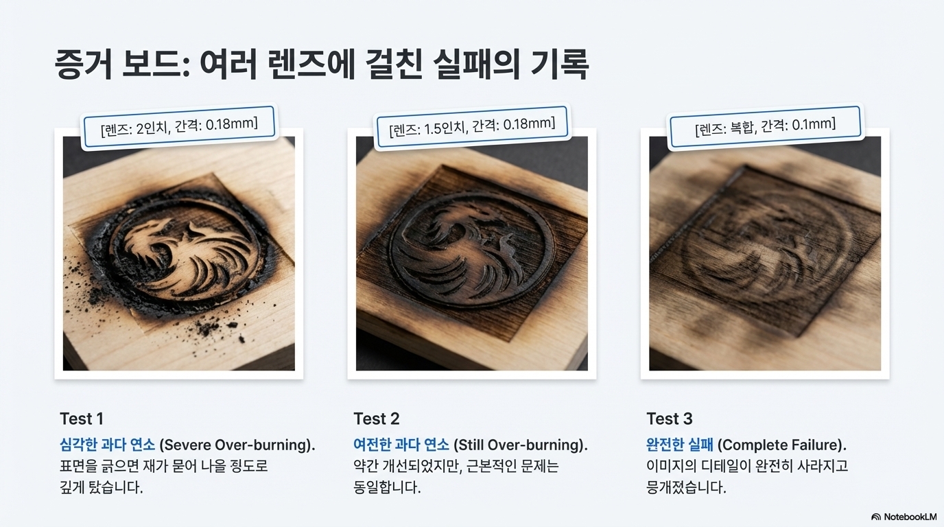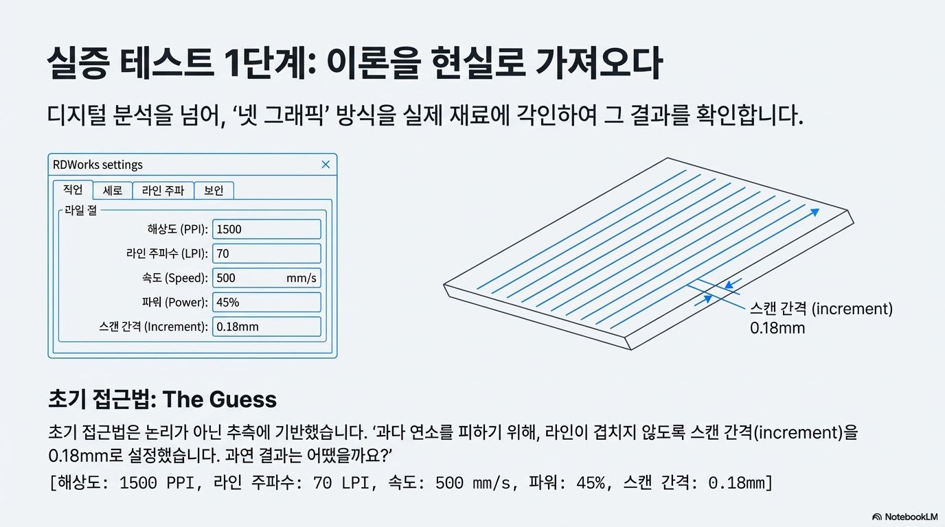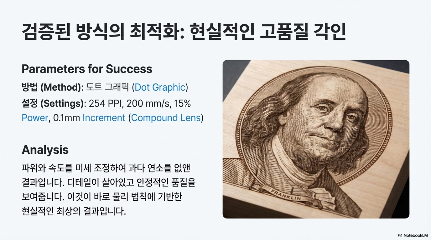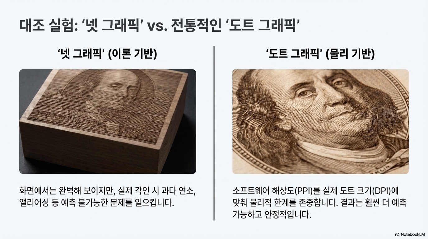이 방법은 모니터 화면상에서는 이미지가 매우 섬세하고 디테일해 보이는 착시 효과를 일으킵니다. 하지만 결정적으로, 이렇게 생성된 덩어리 패턴은 레이저가 물리적으로 점 하나하나를 찍어 정밀하게 재현할 수 없습니다. 분석가는 이 방법이 본질적으로 "속임수"라고 평가합니다. 기계의 실제 출력 능력(DPI)이 아닌, 소프트웨어의 입력 설정값(PPI)을 기준으로 해상도를 주장하기 때문입니다. 이 화면 속 '마법'은 인상적이지만, 과연 실제 재료와 만났을 때도 살아남을 수 있을까요? 이어지는 실제 테스트는 혹독한 현실을 드러냈습니다.