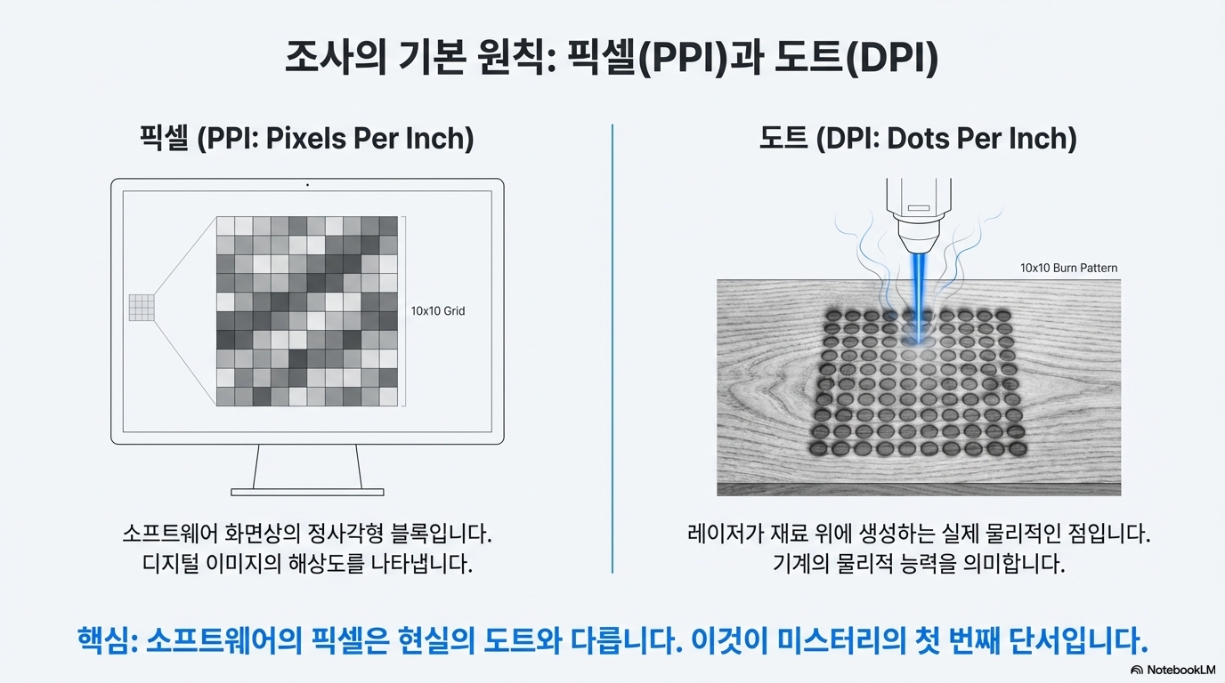 1000 DPI 주장의 실체를 파헤치기 위한 첫 번째 단서는 기술 용어에 대한 근본적인 오해에서 찾을 수 있습니다. 바로 픽셀(Pixel)과 점(Dot)의 결정적인 차이입니다.
