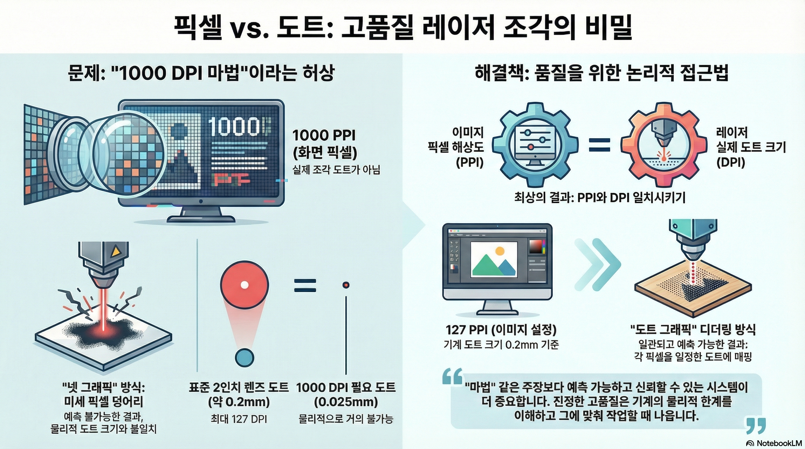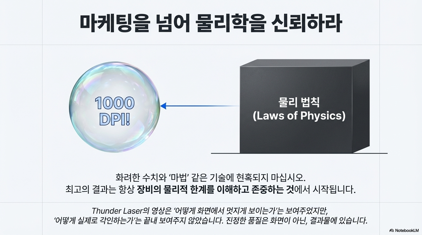 결론적으로, 썬더 레이저의 1000 DPI 주장은 기계의 실제 물리적 출력 능력(DPI)을 반영한 것이 아니라, 소프트웨어의 입력 해상도(PPI)에 초점을 맞춘 마케팅 전략입니다. '넷 그래픽' 방식은 예측이 어렵고, 물리적 현실에 기반한 전통적인 방법에 비해 양질의 결과물로 변환하기가 매우 까다롭습니다. 분석가의 마지막 평가는 단호합니다. "그들은 한 가지를 주장하고, 실제로는 다른 것을 하고 있습니다."