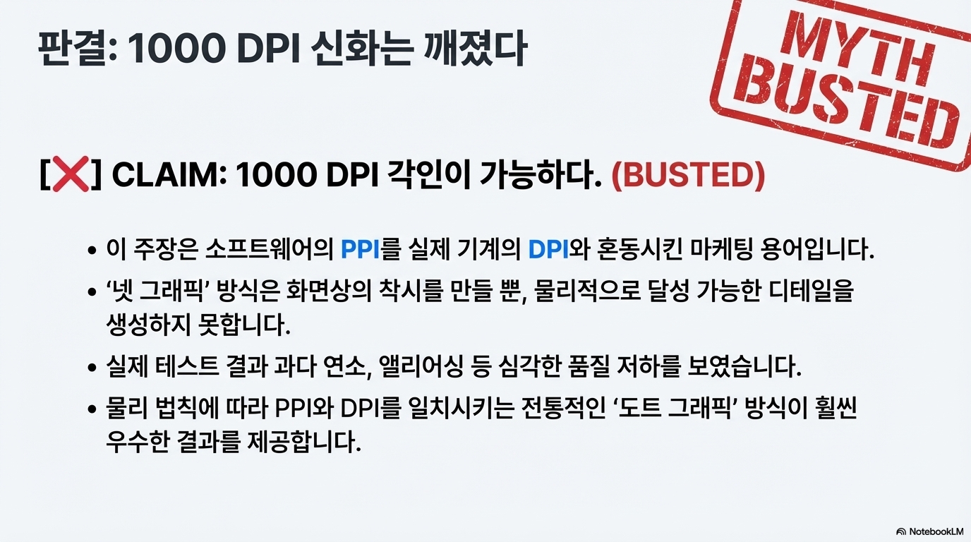 그들이 자랑하는 특수 "고해상도 헤드"조차도 만들 수 있는 점의 크기가 0.05mm라고 명시되어 있습니다. 여기서 다시 간단한 계산을 해볼 수 있습니다. 0.05mm 크기의 점들을 빈틈없이 나란히 배열할 경우, 1인치 안에 들어갈 수 있는 점의 최대 개수는 몇 개일까요? (1인치, 즉 25.4mm를 0.05mm로 나누면 508, 즉 약 500 DPI가 됩니다.) 그렇습니다. 그들 최고의 기술로도 물리적 최대 해상도는 1000 DPI가 아닌 500 DPI인 것입니다.