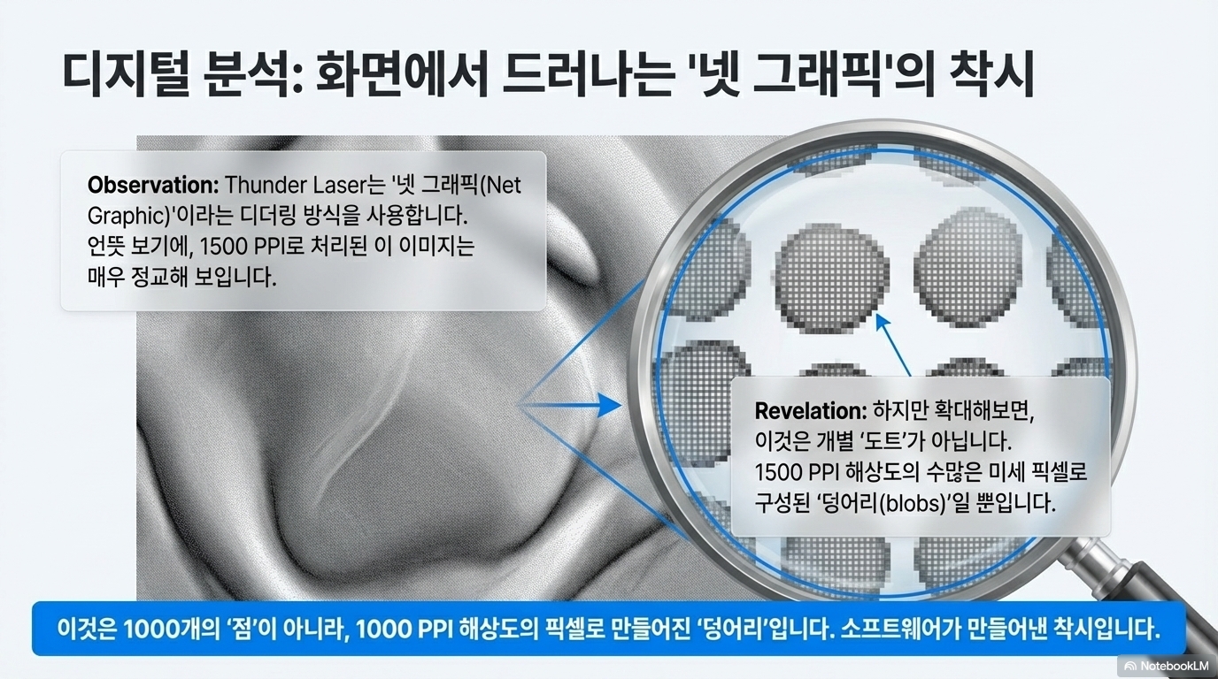 그렇다면 그들은 어떻게 이런 착시를 만들어낼까요? 파헤쳐보니, 그 비결은 '넷 그래픽(Net Graphic)'이라는 교묘한 소프트웨어 기술에 있었습니다. 이 기술은 디더링(dithering, 제한된 색상으로 더 많은 색상을 표현하는 이미지 처리 기법)의 일종으로, 모든 픽셀에 대해 하나의 점을 생성하는 대신 1500 PPI와 같은 매우 높은 입력 해상도를 사용해 화면에 패턴화된 '덩어리(blobs)'를 만들어냅니다.