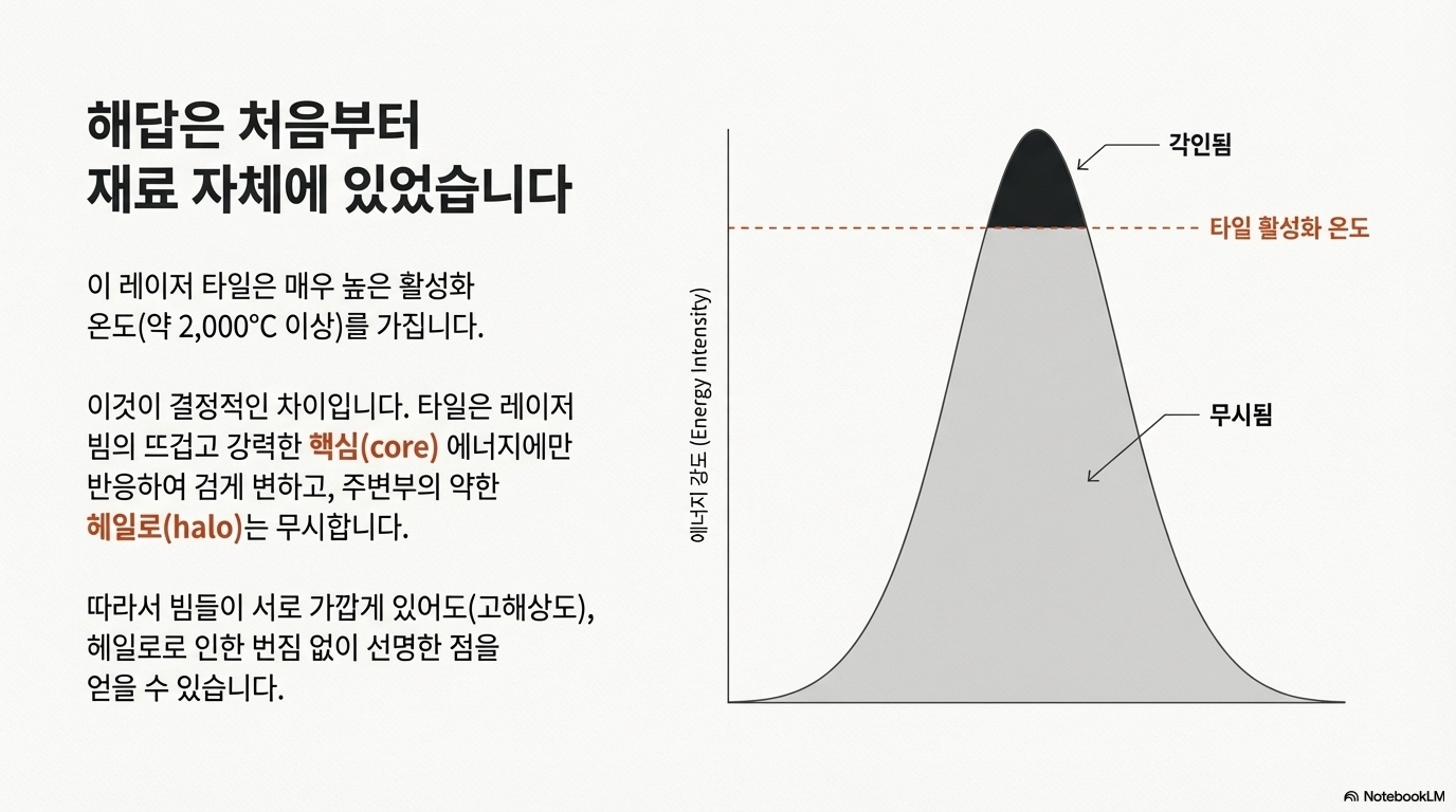 기계가 스스로와 싸우는 듯한 이 역설적인 상황—전자 장치에는 너무 빠르고, 기계 장치에는 너무 느린—속에서, 해답은 완전히 다른 변수에서 찾아야 했습니다. 바로 재료 자체였죠. 이 실험의 성공은 특수 열감응 '레이저 타일'이 있었기에 가능했습니다.