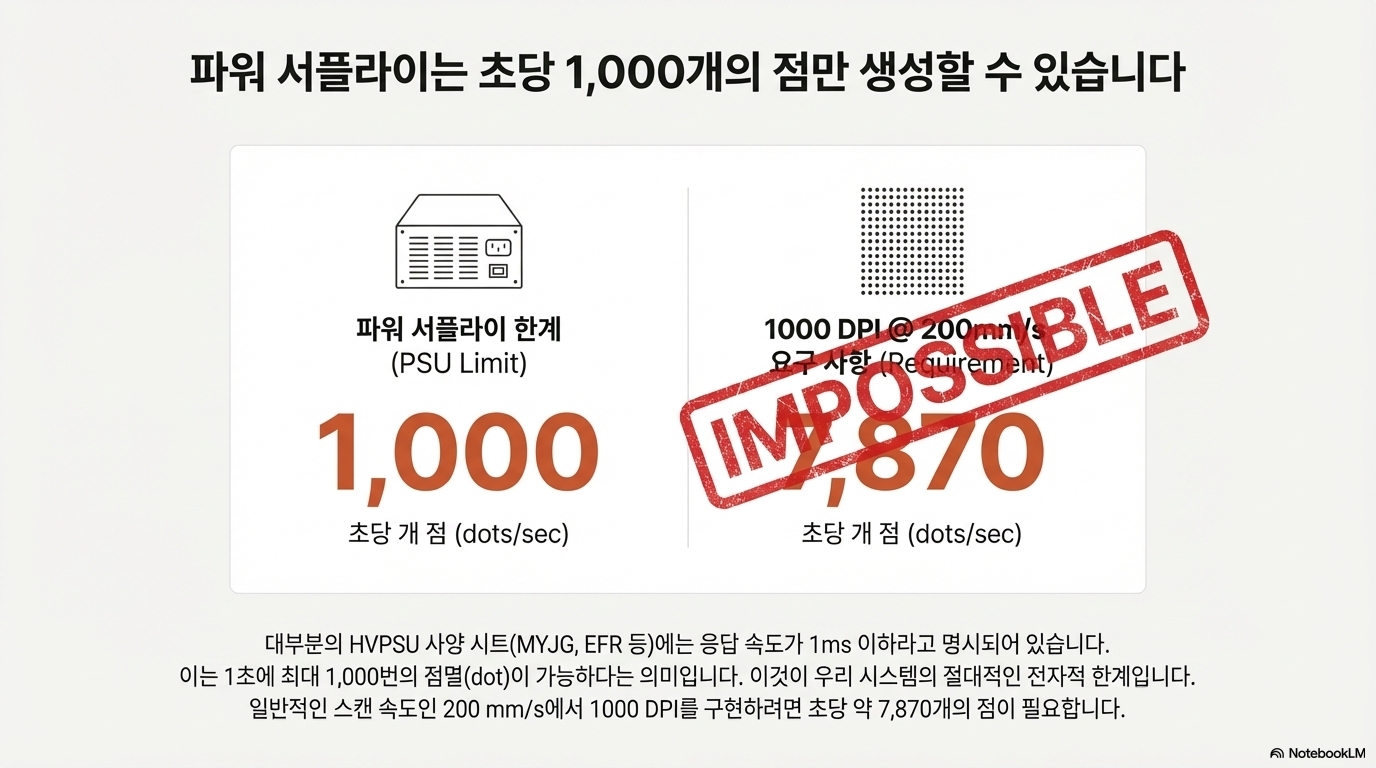 파워 서플라이의 초당 1,000개 점 발사 한계는 원하는 DPI와 최대 스캔 속도 사이에 깨지지 않는 물리적 법칙을 만듭니다.