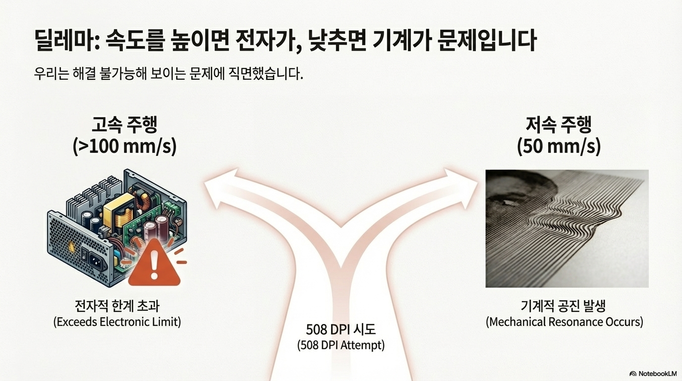 이 깨지지 않는 법칙을 알게 된 우리는 508 DPI를 달성하기 위해 스캔 속도를 50mm/s로 낮췄습니다. 하지만 전자적인 병목 현상을 해결하자마자, 전혀 예상치 못한 새로운 기계적인 문제가 모습을 드러냈습니다. 바로 **스테퍼 모터의 기계적 공진(resonance)**이었습니다.