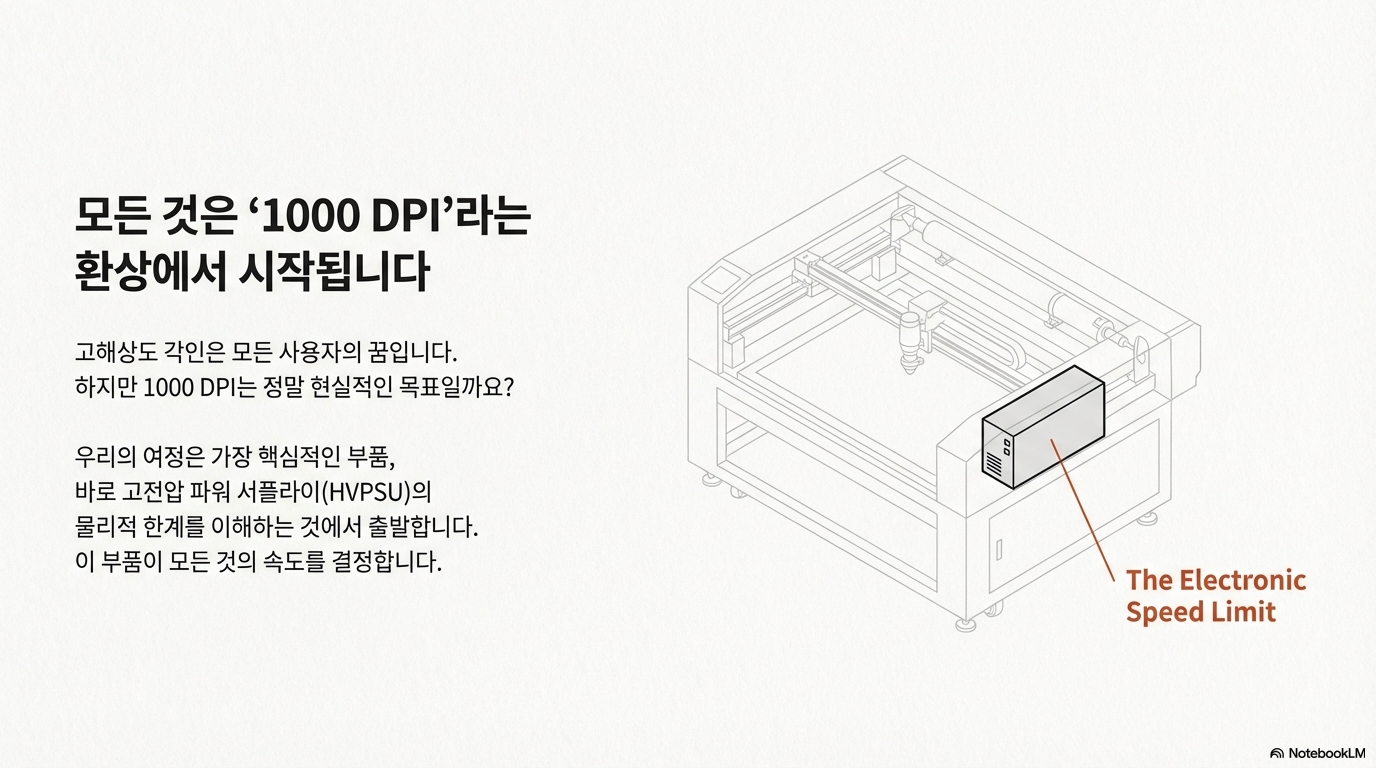가장 놀라운 첫 번째 발견은 이것입니다. 대부분의 기기에서 1000 DPI를 달성하는 것은 물리적으로 불가능합니다. 그 이유는 레이저나 렌즈의 성능 때문이 아니라, 바로 고전압(HV) 파워 서플라이의 응답 속도 때문입니다.