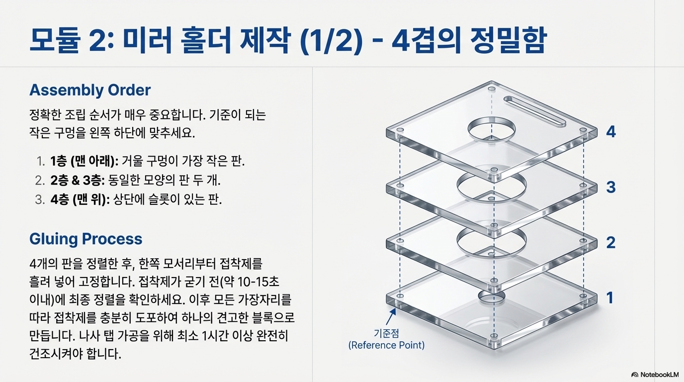 - 재료의 단순화: 프로젝트에 4mm와 2mm 두께의 부품이 모두 필요했지만, 제작자는 사용자가 두 종류의 아크릴판을 모두 구매하는 번거로움을 덜어주었습니다. 대신 2mm 아크릴판 두 개를 정밀하게 접착하여 4mm 두께의 부품을 만드는 방법을 채택했습니다. 이는 재료비를 절감하고 제작 과정을 단순화하는 현명한 선택입니다.