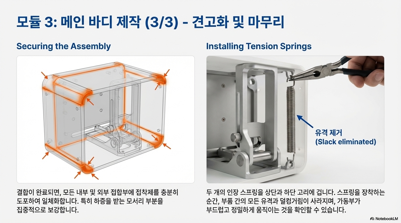 하지만 해결책은 우아한 단순함의 힘을 보여주는 놀라운 순간이었습니다. 제작자는 단 두 개의 작은 텐션 스프링을 추가했습니다. 그러자 마법처럼 모든 흔들림이 사라지고 전체 구조가 단단하게 고정되었습니다. 이 순간은 복잡한 기계적 문제를 해결하는 답이 때로는 거창한 재설계가 아닌, 이처럼 작고 명쾌한 아이디어에서 비롯된다는 것을 명확히 보여줍니다. 정밀한 설계에서 사소해 보이는 디테일 하나가 얼마나 결정적인 차이를 만드는지 보여주는 훌륭한 예시입니다.