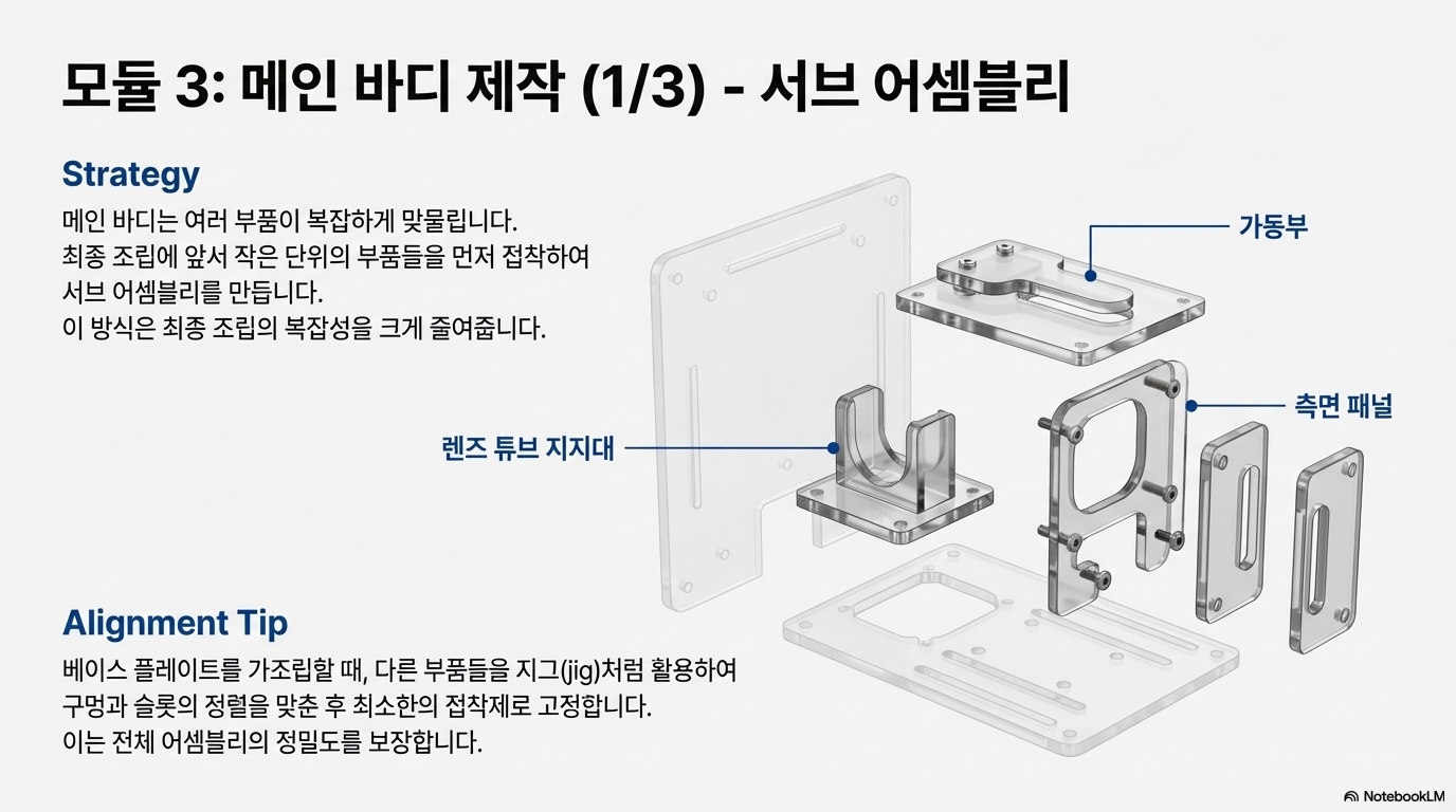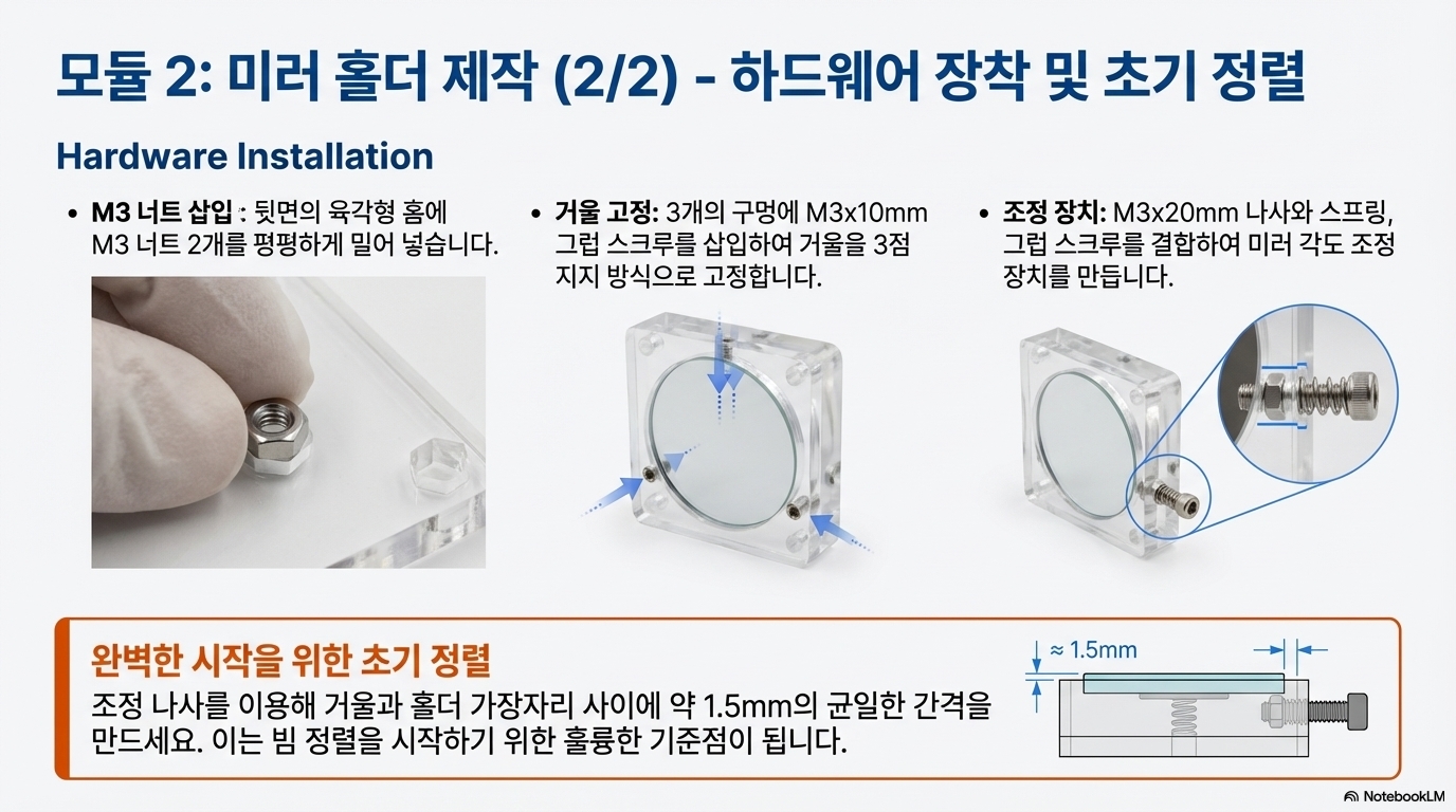 - 수작업 공정 시연: 모든 사람이 나사산을 내는 전문 태핑(tapping) 공구를 가지고 있지는 않습니다. 이를 고려하여 제작자는 특별한 도구 없이 손으로 직접 아크릴에 나사산을 내는 방법을 매우 신중하고 상세하게 보여줍니다. 이는 기술적 장벽을 낮추려는 의도적인 노력입니다.