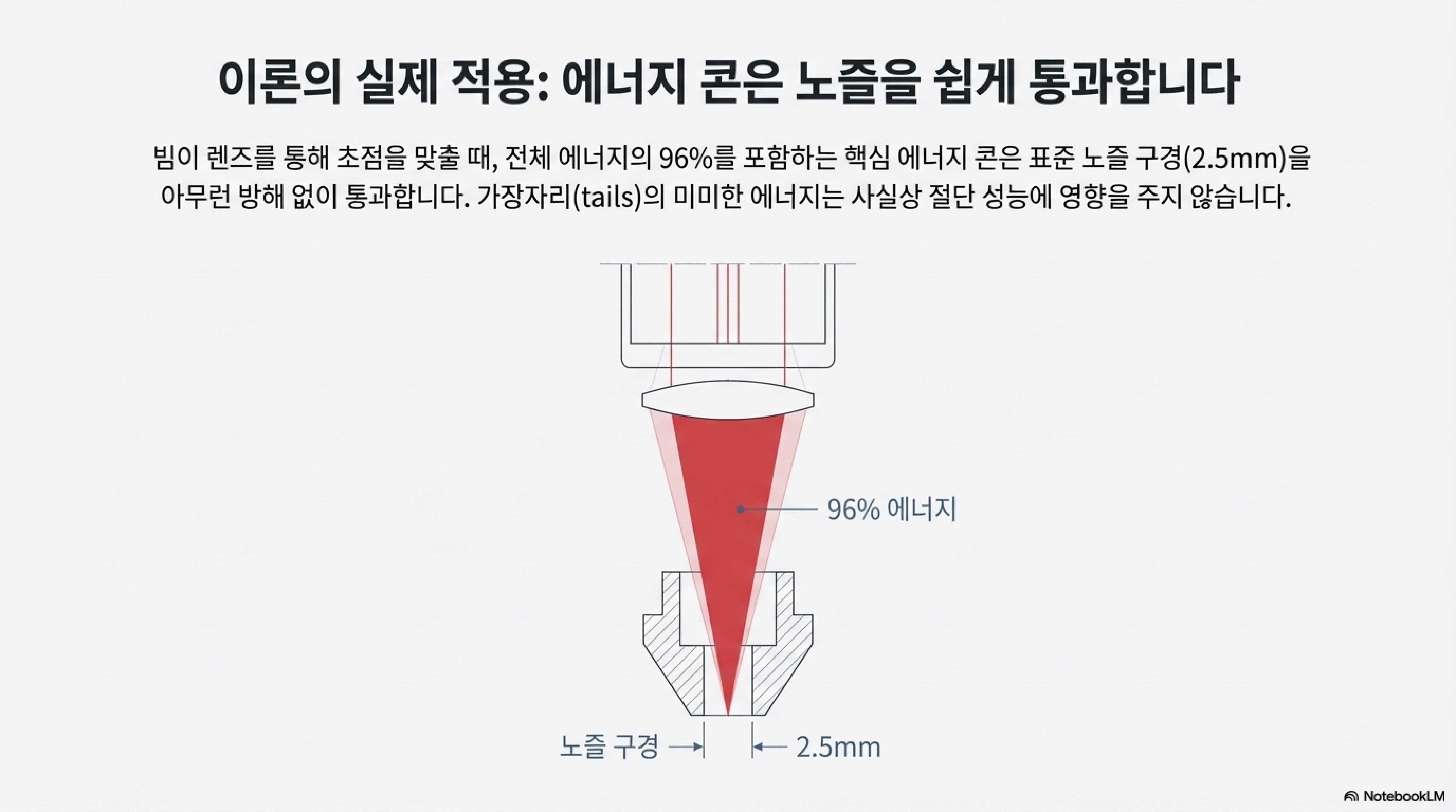 결론적으로, 제조사가 틀린 것이 아닙니다. 핵심은 '유효 출력'이 어디에 있는지를 이해하는 것입니다. 절단에 실질적으로 기여하는 거의 모든 에너지는 빔의 중심부에 몰려 있으며, 에너지가 미미한 바깥쪽 가장자리는 절단 과정에 거의 영향을 주지 않습니다.