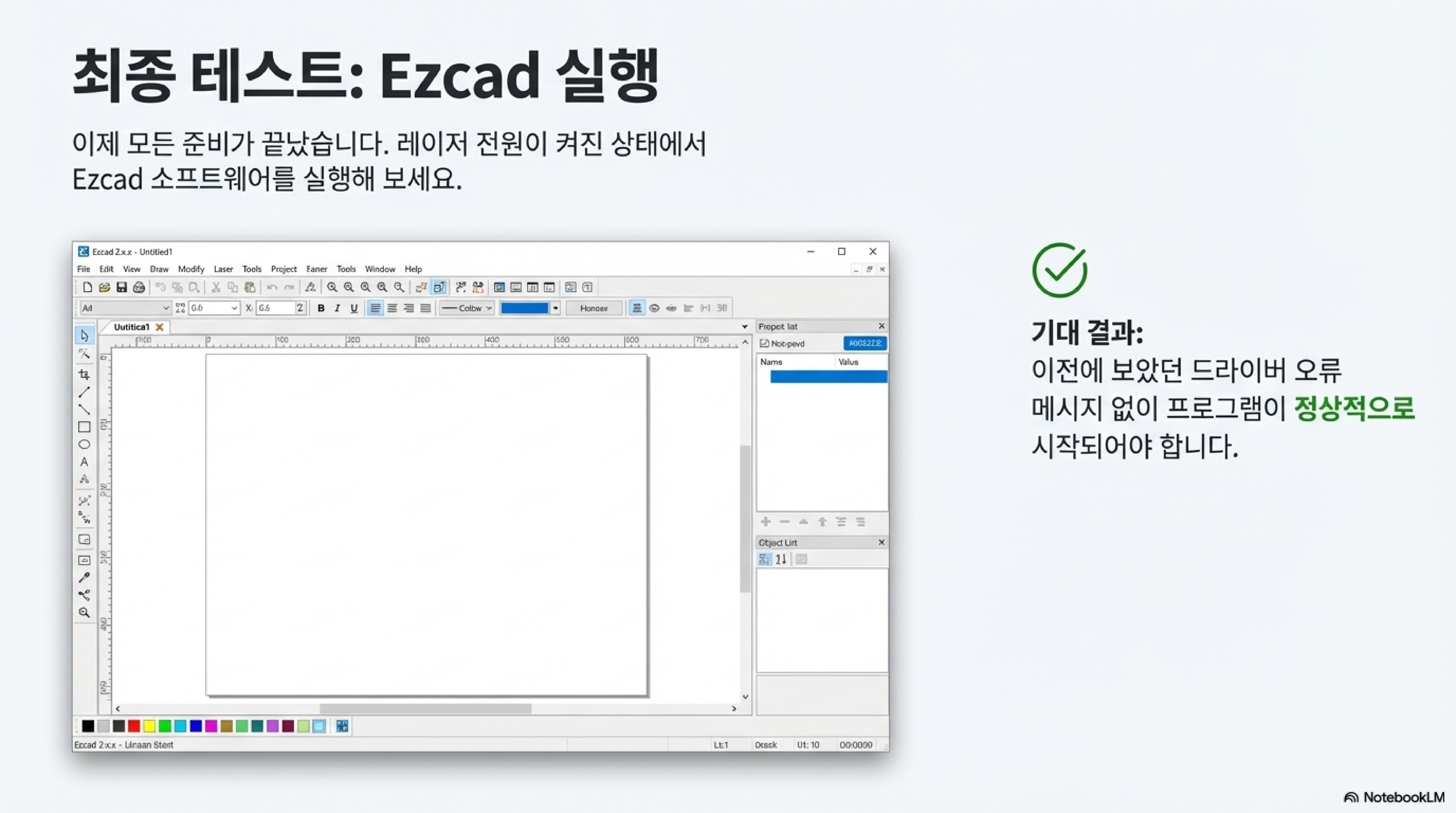 Ezcad 소프트웨어는 실행될 때 레이저의 컨트롤러 보드와 반드시 통신해야 합니다. 만약 장비의 전원이 꺼져 있다면, 소프트웨어는 보드를 찾지 못하고 이를 드라이버 관련 오류로 표시합니다. 이는 매우 오해하기 쉬운 상황으로, 복잡한 소프트웨어 문제 해결에 뛰어들기 전에 가장 기본적인 물리적 연결 상태(전원이 켜져 있는지)부터 확인해야 한다는 중요한 교훈을 줍니다.