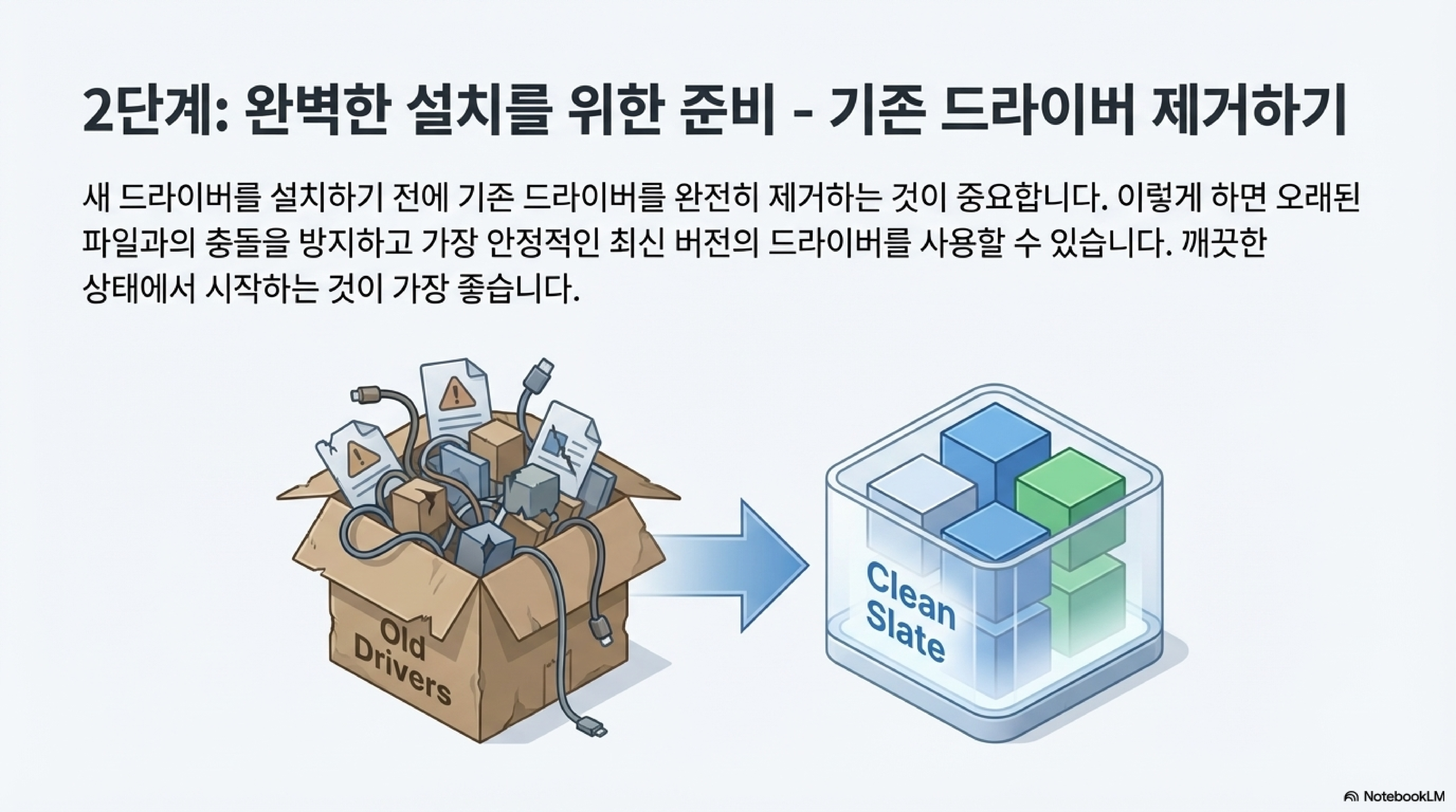 - 기존 드라이버 완전 삭제: 가장 좋은 방법은 깨끗한 상태에서 시작하는 것입니다. 새 드라이버를 설치하기 전, 장치 관리자에서 해당 장치를 마우스 오른쪽 버튼으로 클릭하고 '디바이스 제거'를 선택하세요. 이때, "이 장치의 드라이버를 제거합니다" 옵션의 확인란을 반드시 체크해야 이전 파일과의 충돌을 막을 수 있습니다.
