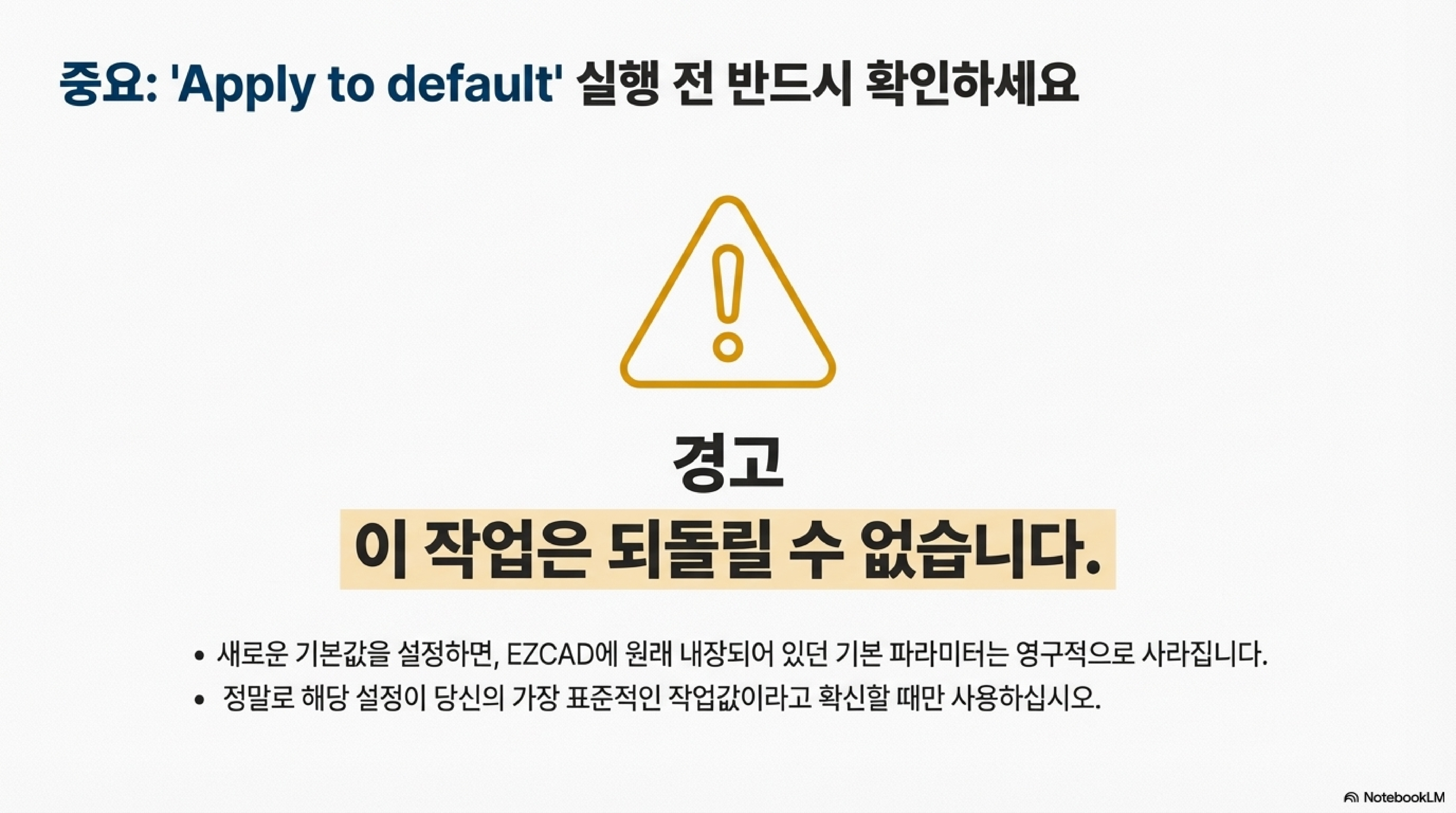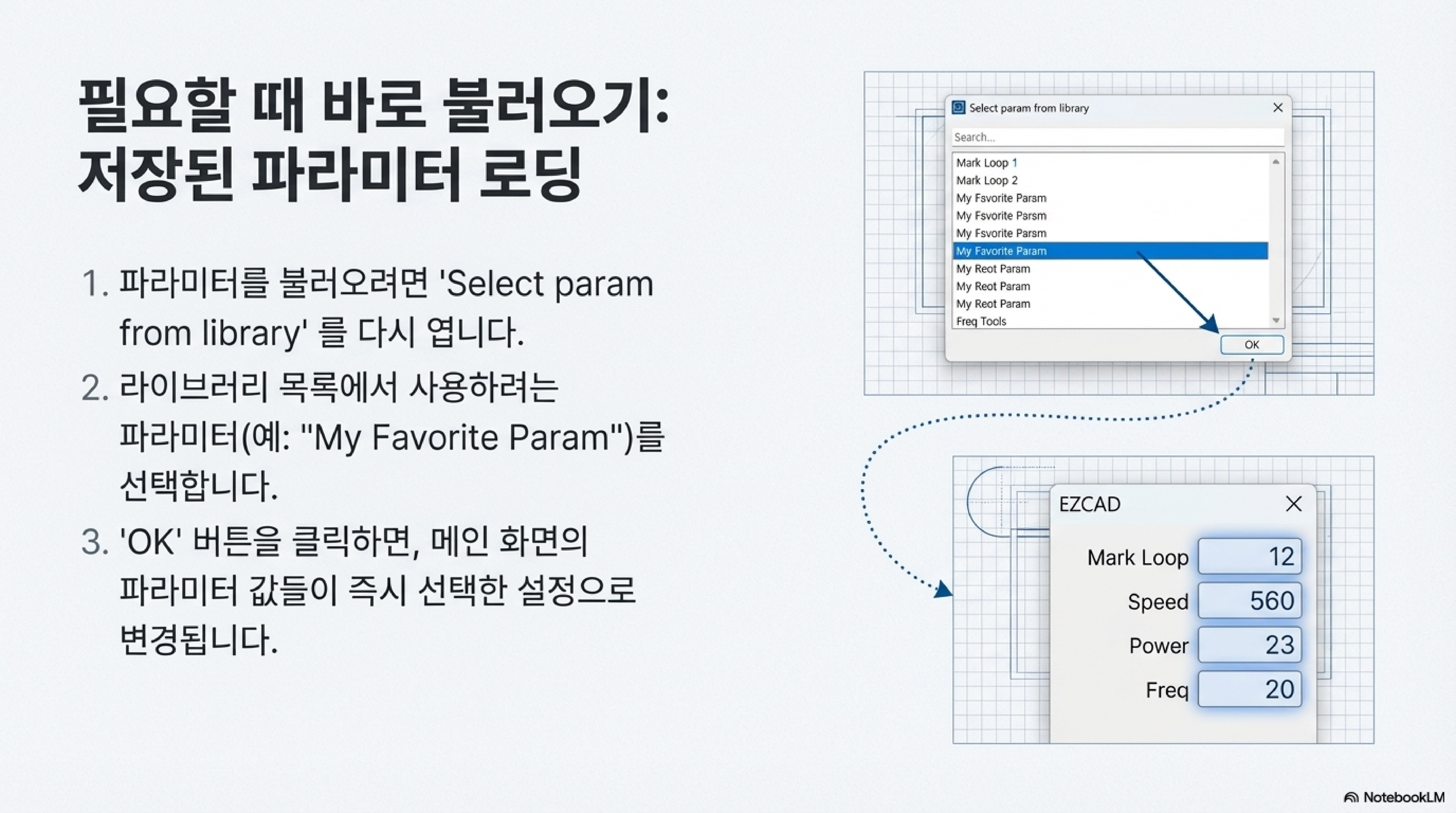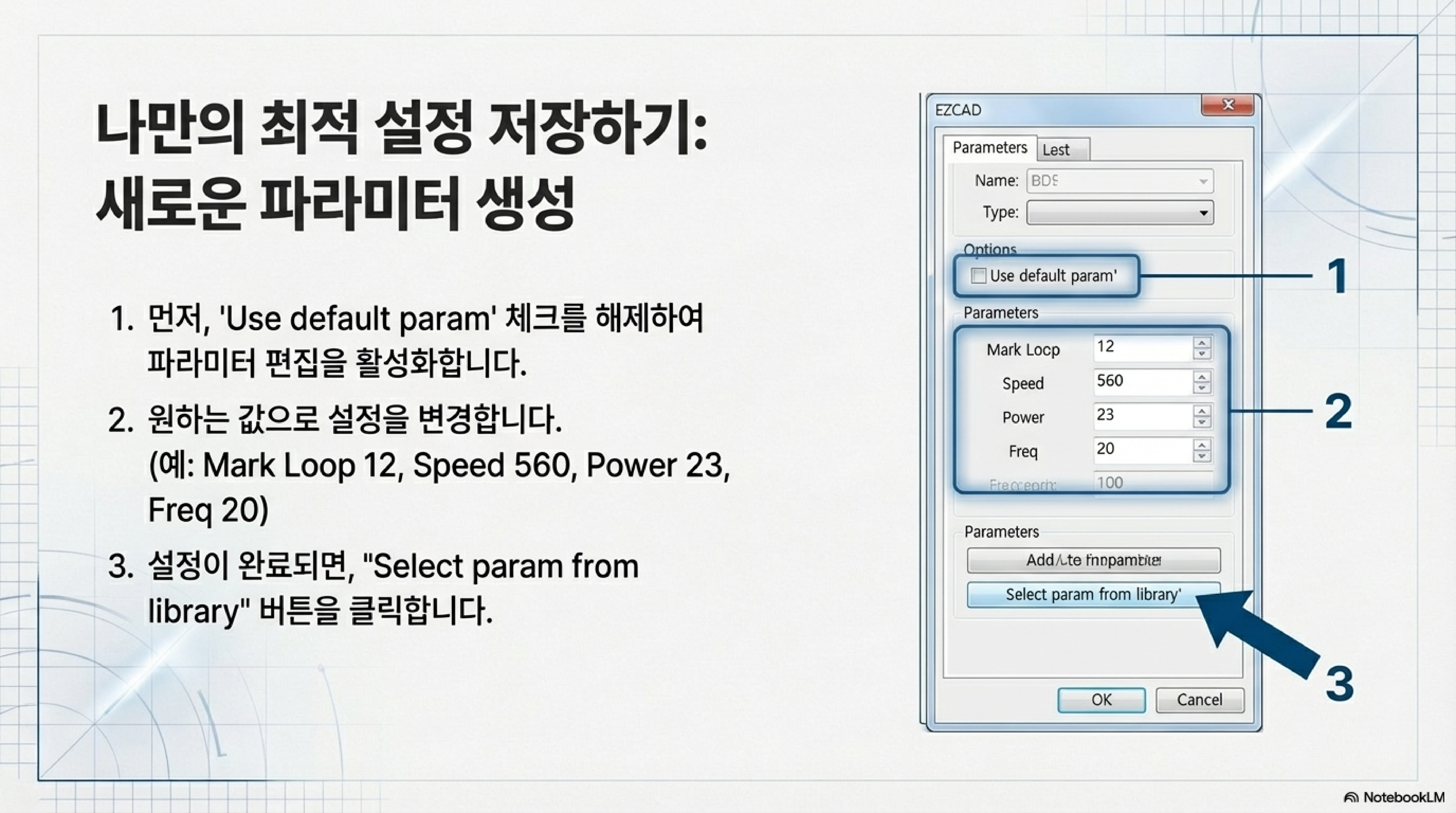 하지만 진짜 '비법'은 지금부터입니다. 만약 여러분이 매일같이 사용하는, 거의 모든 작업의 기준이 되는 '최고의 값'이 있다면, 그것을 EZCAD의 기본값(Default)으로 덮어쓰는 것입니다. 방법은 간단합니다. Select param from library 창에서 여러분의 '최고의 값'을 선택한 뒤, Apply to default 버튼을 클릭하기만 하면 됩니다.