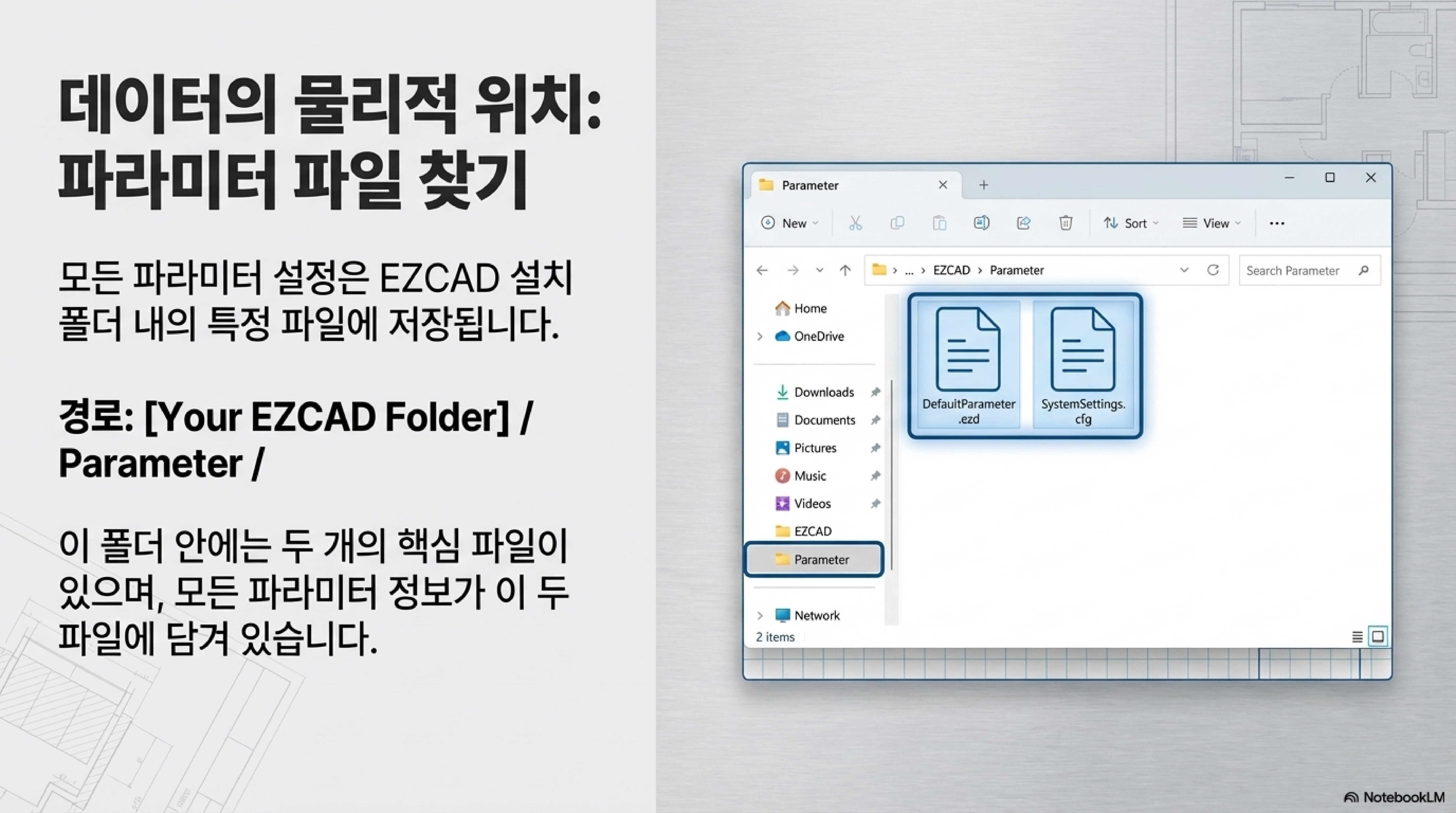 많은 사용자들이 모르는 사실이지만, 여러분이 저장하는 모든 파라미터 설정은 프로그램 내의 추상적인 데이터가 아닙니다. EZCAD 프로그램이 설치된 폴더를 열어보면 'Parameter'라는 이름의 하위 폴더가 있고, 그 안에 실제 파일 형태로 모든 설정값이 저장되어 있습니다.