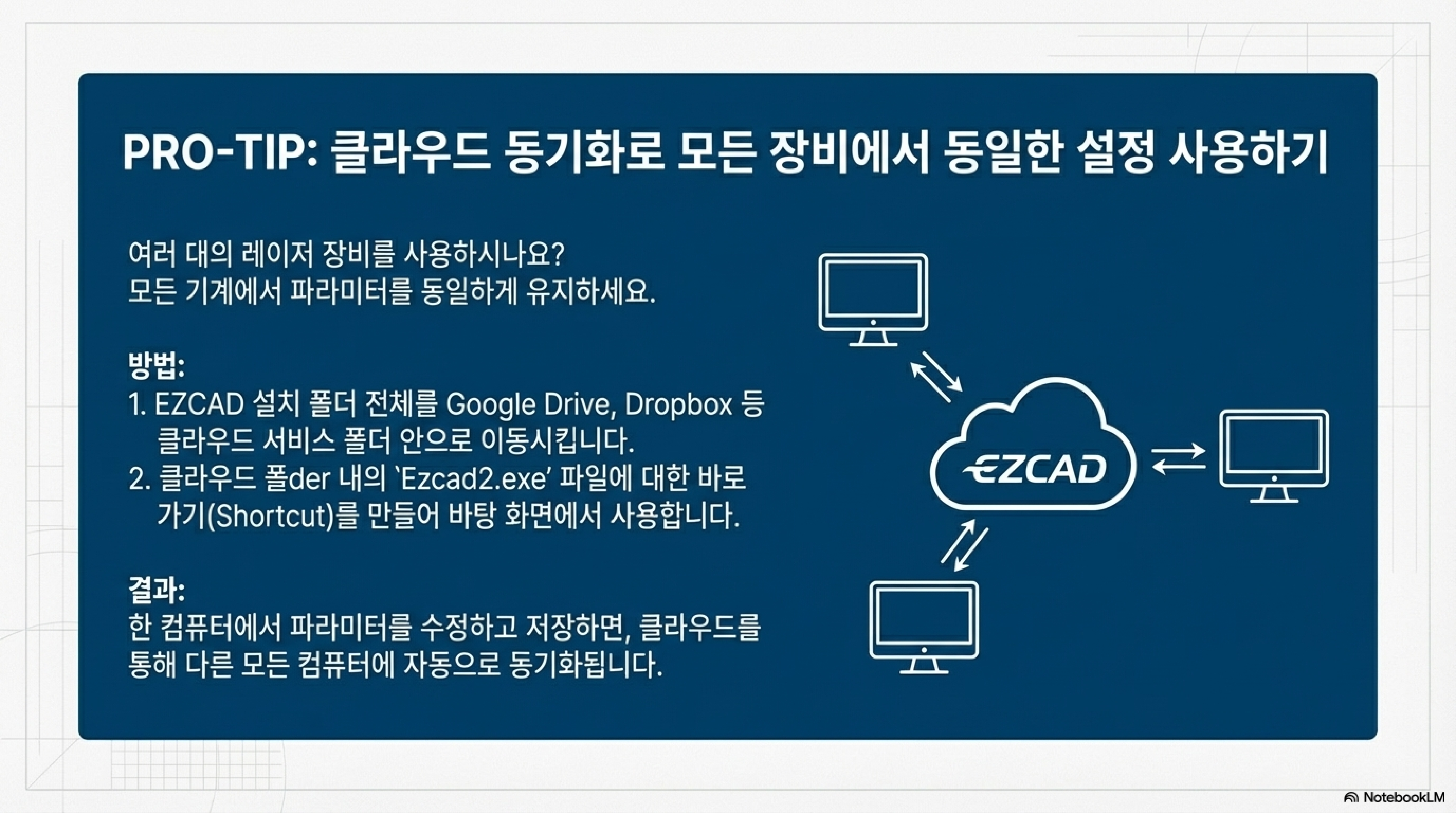 이 방법의 작동 원리는 놀랍도록 효율적입니다. 여러분이 A 컴퓨터에서 새로운 파라미터를 저장하면, 이 변경사항은 즉시 클라우드 서버에 동기화됩니다. 그리고 클라우드 서비스는 이 변경사항을 여러분의 계정에 연결된 다른 모든 컴퓨터(B, C 컴퓨터)의 EZCAD 폴더에 자동으로 업데이트합니다.