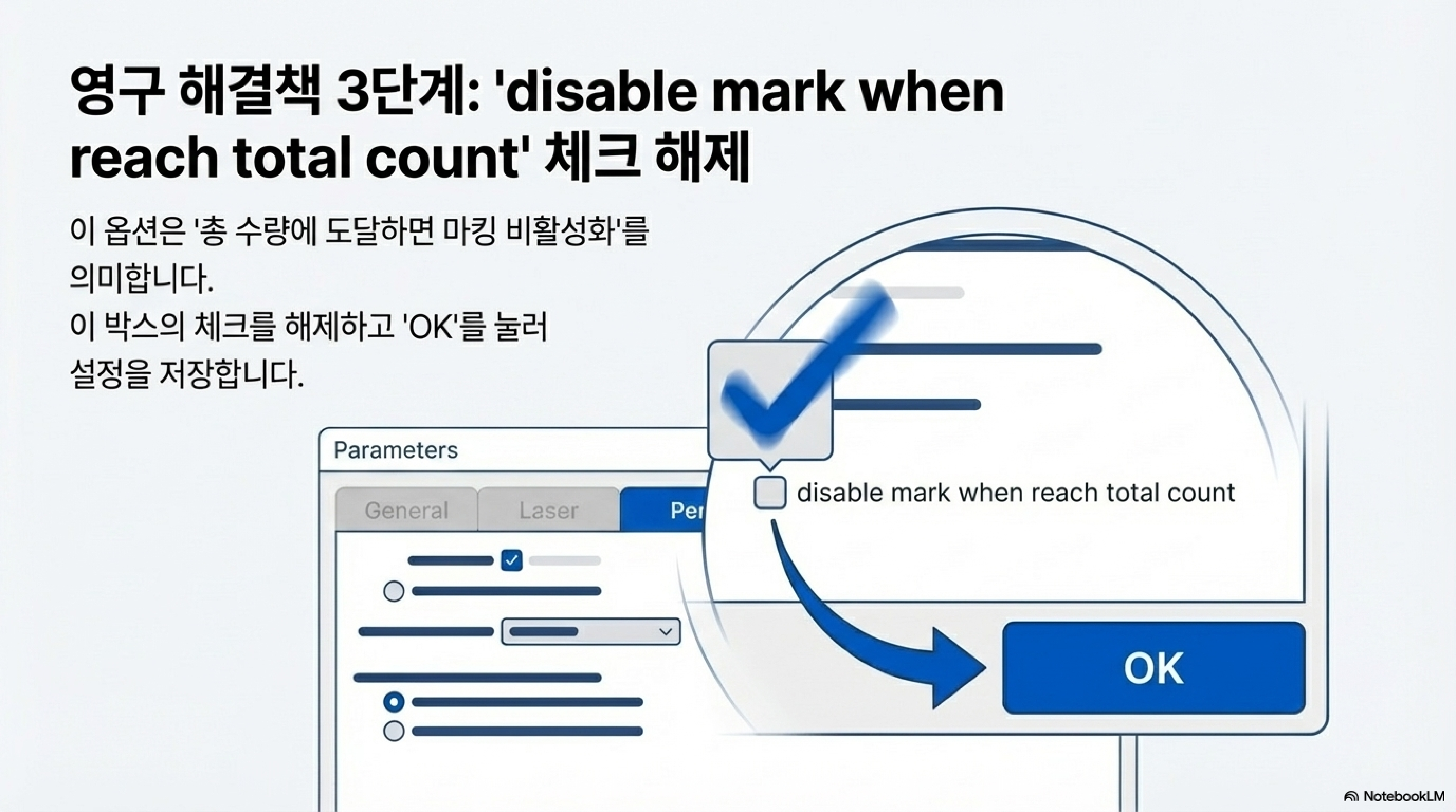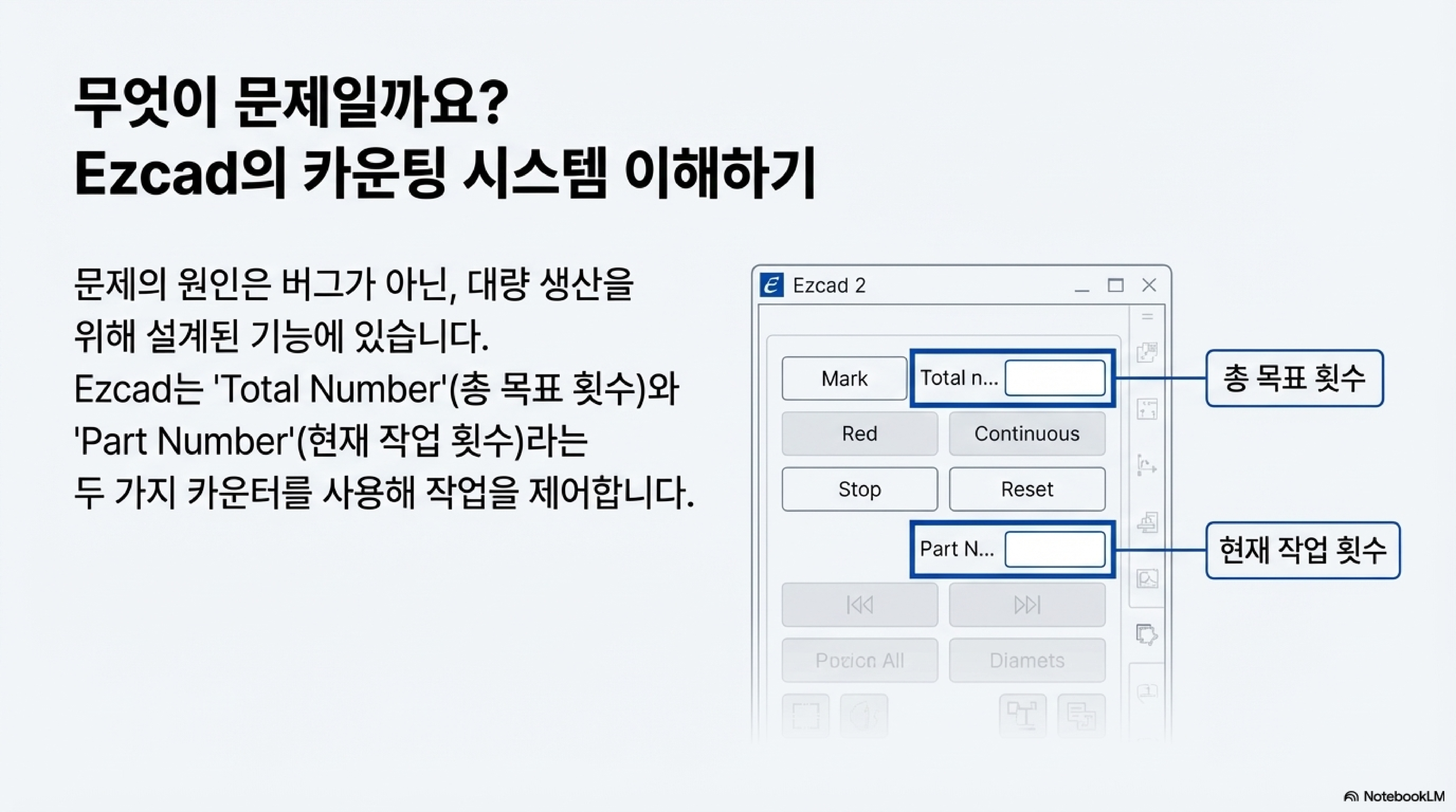 "여러분이 설정한 '총 작업 횟수'가 바로 최종 '목표'인 셈입니다. 그런데 레이저는 이미 그 목표치만큼 부품을 가공했기 때문에, 더 이상 작업을 실행할 수 없다고 알려주는 것이죠."