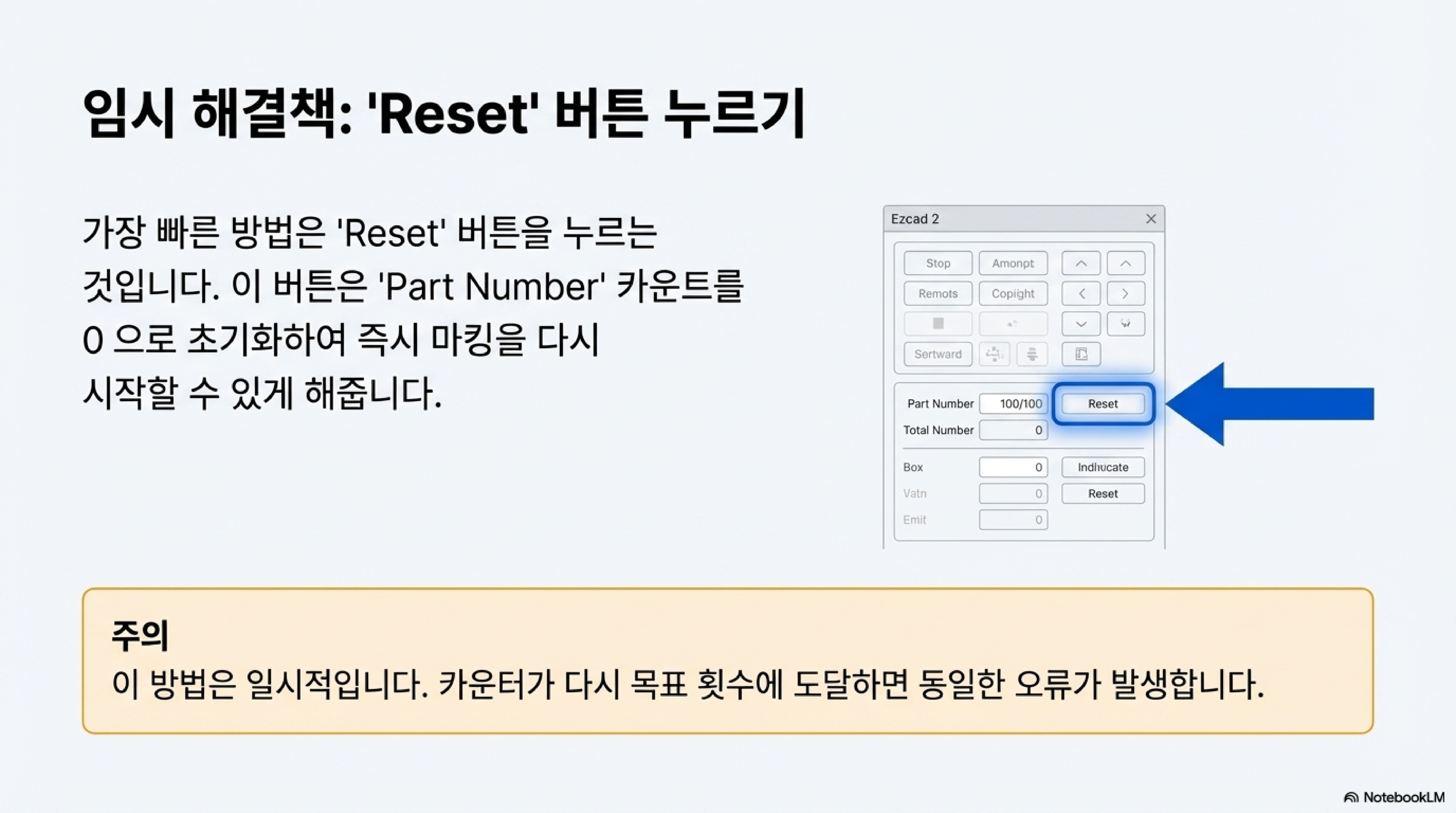 이 버튼을 누르면 'part number' 카운터가 즉시 0으로 초기화됩니다. 카운터가 0이 되면 다시 설정된 'total number'에 도달하기 전까지 작업을 자유롭게 실행할 수 있게 됩니다.