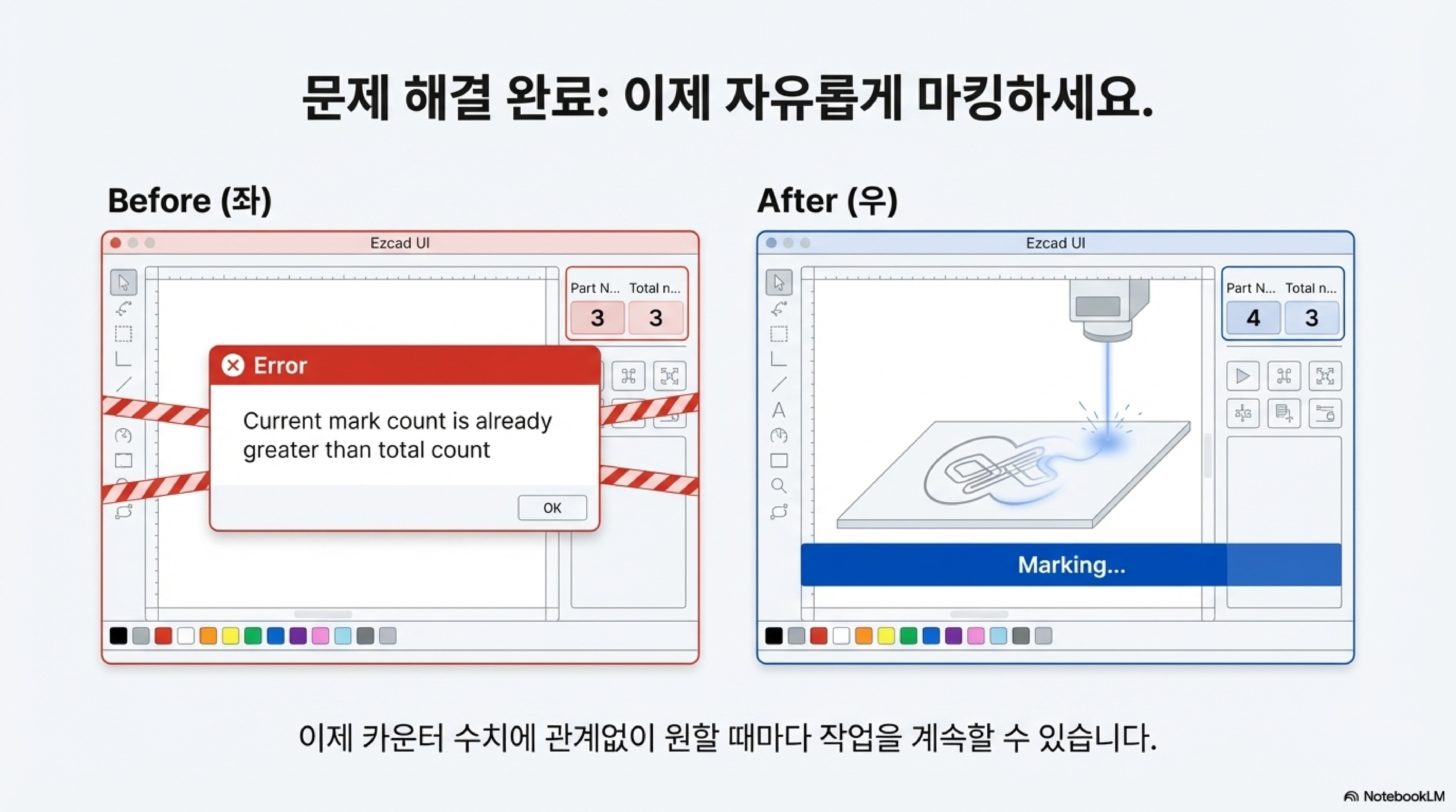 오류는 'part number'(현재 횟수)가 'total number'(목표 횟수)에 도달했거나 초과했을 때 발생합니다. 즉, 소프트웨어는 설정된 목표만큼 작업을 완료했으니 더 이상 실행할 수 없다고 알려주는 것입니다. 이 기능은 사실 '100개의 부품만 정확히 각인'해야 하는 대량 생산 환경에서는 실수를 방지하는 유용한 안전장치입니다. 하지만 반복적인 테스트나 단일 작업을 계속해야 하는 사용자에게는 큰 불편을 초래합니다.