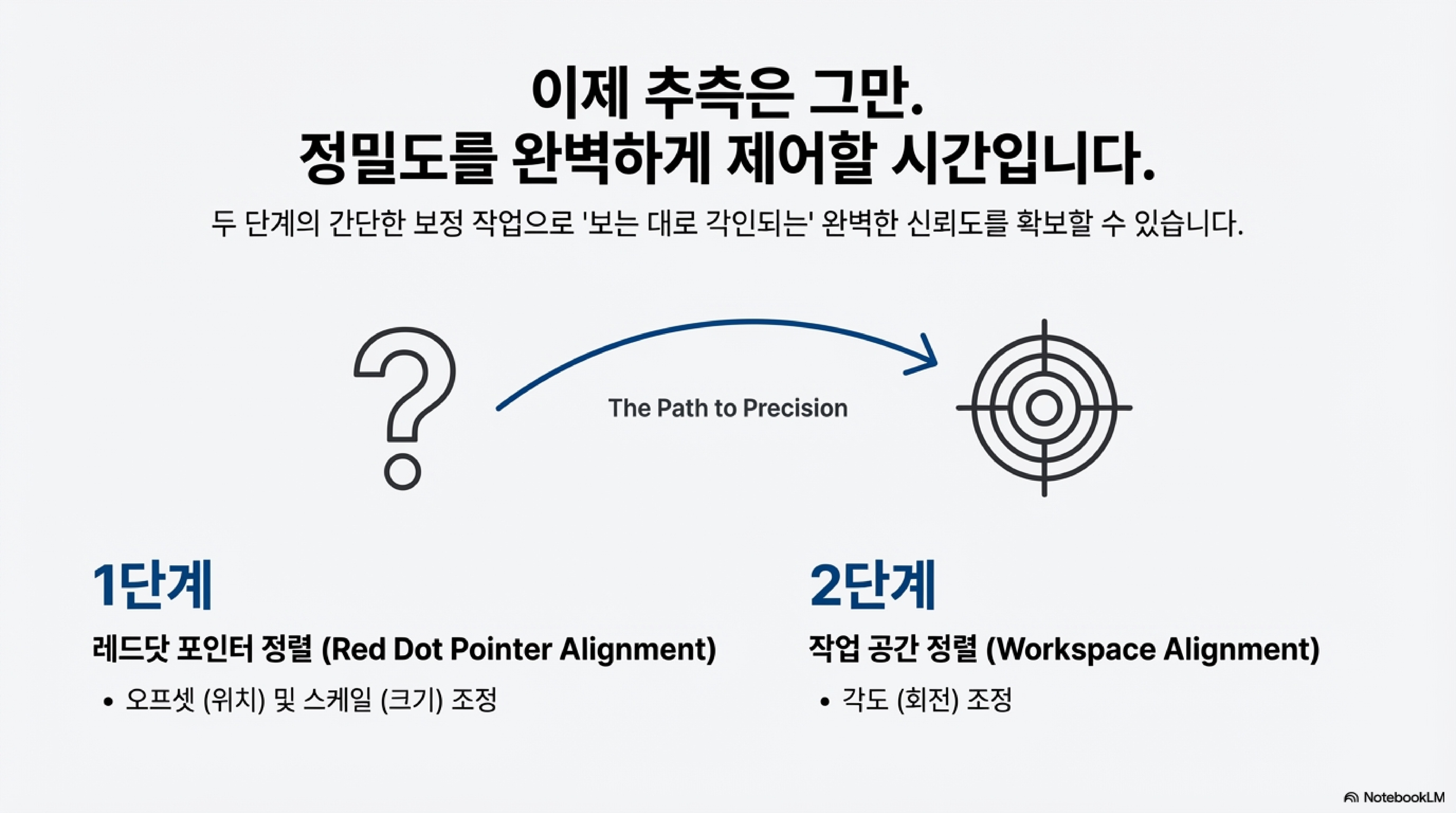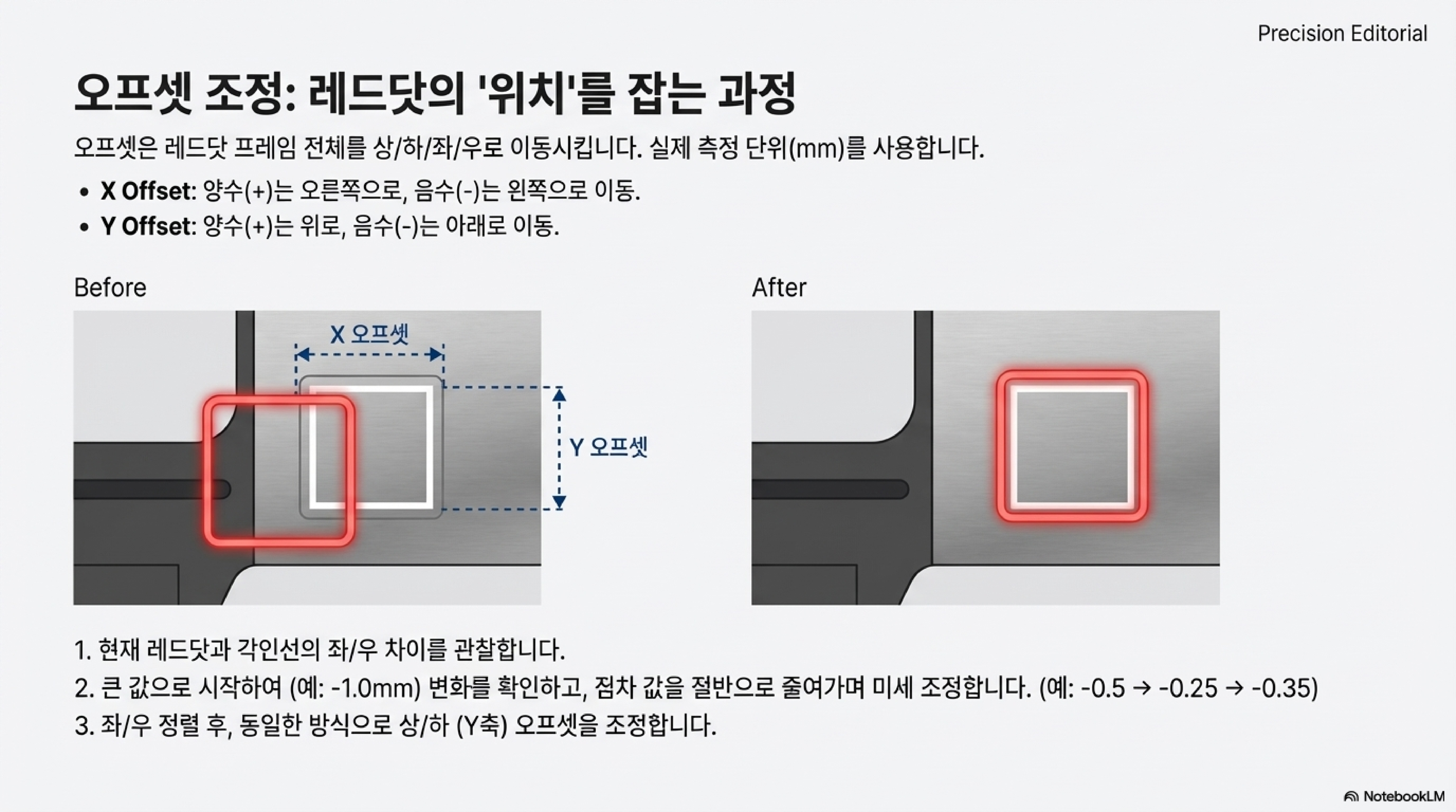 흔히 정렬 작업을 할 때 위치(Offset)를 먼저 맞추고, 그 다음에 크기(Scale)를 맞추면 될 것이라고 생각합니다. 하지만 이는 잘못된 접근법입니다. 레드닷 정렬 과정은 오프셋과 스케일 값이 서로에게 영향을 미치는, 마치 춤을 추듯 반복적인 조정이 필요한 '추측과 확인의 게임(game of guess and check)'과 같습니다. 하나를 조정하면 다른 하나가 미세하게 틀어지기 때문에, 기본값(Offset=0, Scale=1)에서 시작하여 두 설정 사이를 오가며 점진적으로 값을 찾아나가야 합니다. 이 과정이 처음에는 답답하게 느껴질 수 있지만, 원래부터 한 번에 끝나지 않는 작업임을 인지하면 훨씬 수월해집니다.