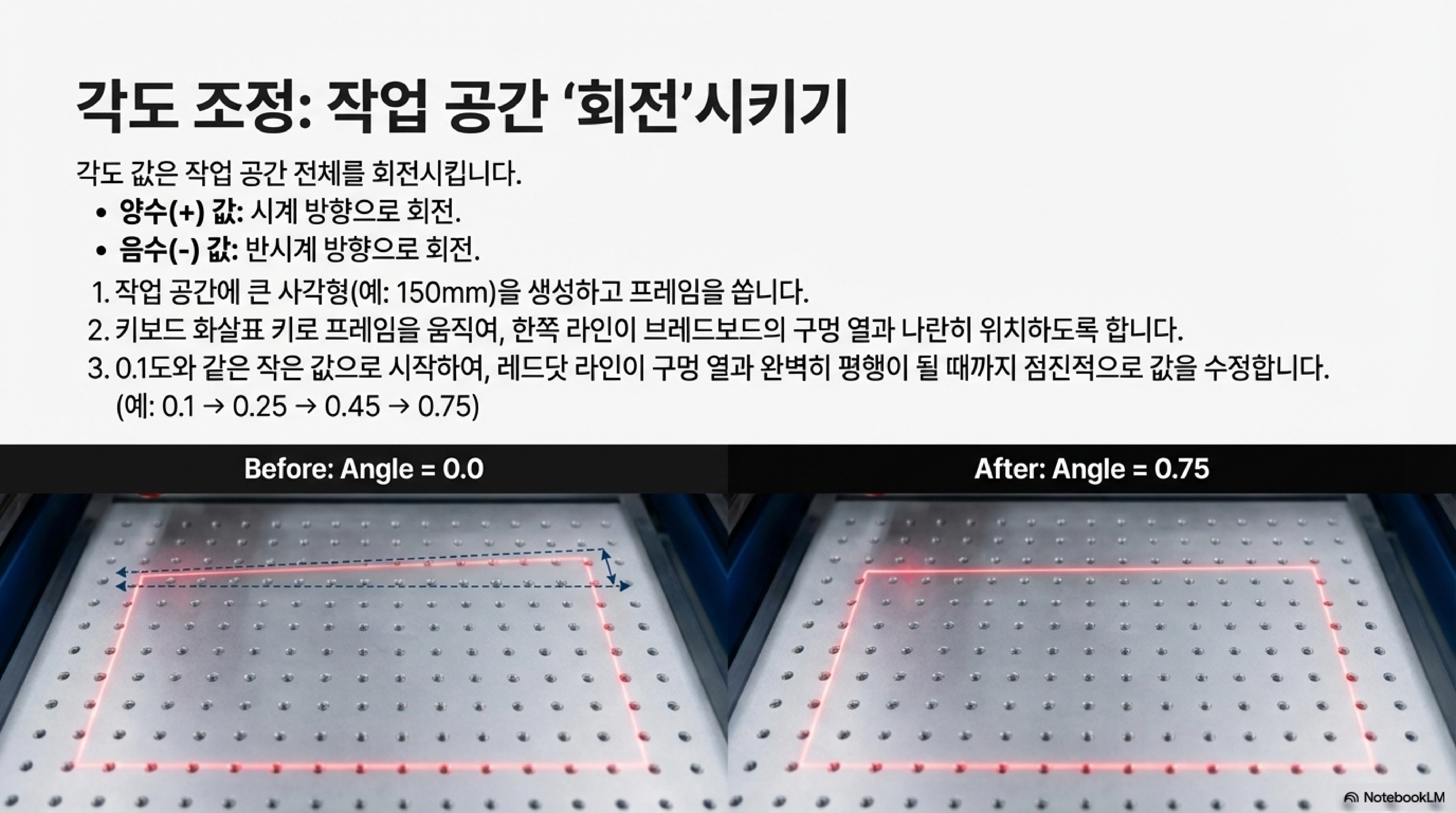 작업대의 지그나 고정 홀에 맞춰 미리보기를 했을 때 각인될 사각형이 비뚤어져 보인다면, 많은 사람들이 레이저 갈보 헤드를 물리적으로 돌려야 한다고 생각합니다. 하지만 이는 장비에 손상을 줄 수 있는 위험하고 부정확한 방법입니다. 이 "물리적인" 문제는 LightBurn이나 EasyCAD 같은 소프트웨어 내의 '각도(angle)' 설정을 통해 안전하고, 반복 가능하며, 수학적으로 정밀하게 해결할 수 있습니다. 위험천만한 물리적 조정 대신 안전하고 확실한 소프트웨어 해법을 선택하는 것, 이것이 바로 전문가의 방식입니다.