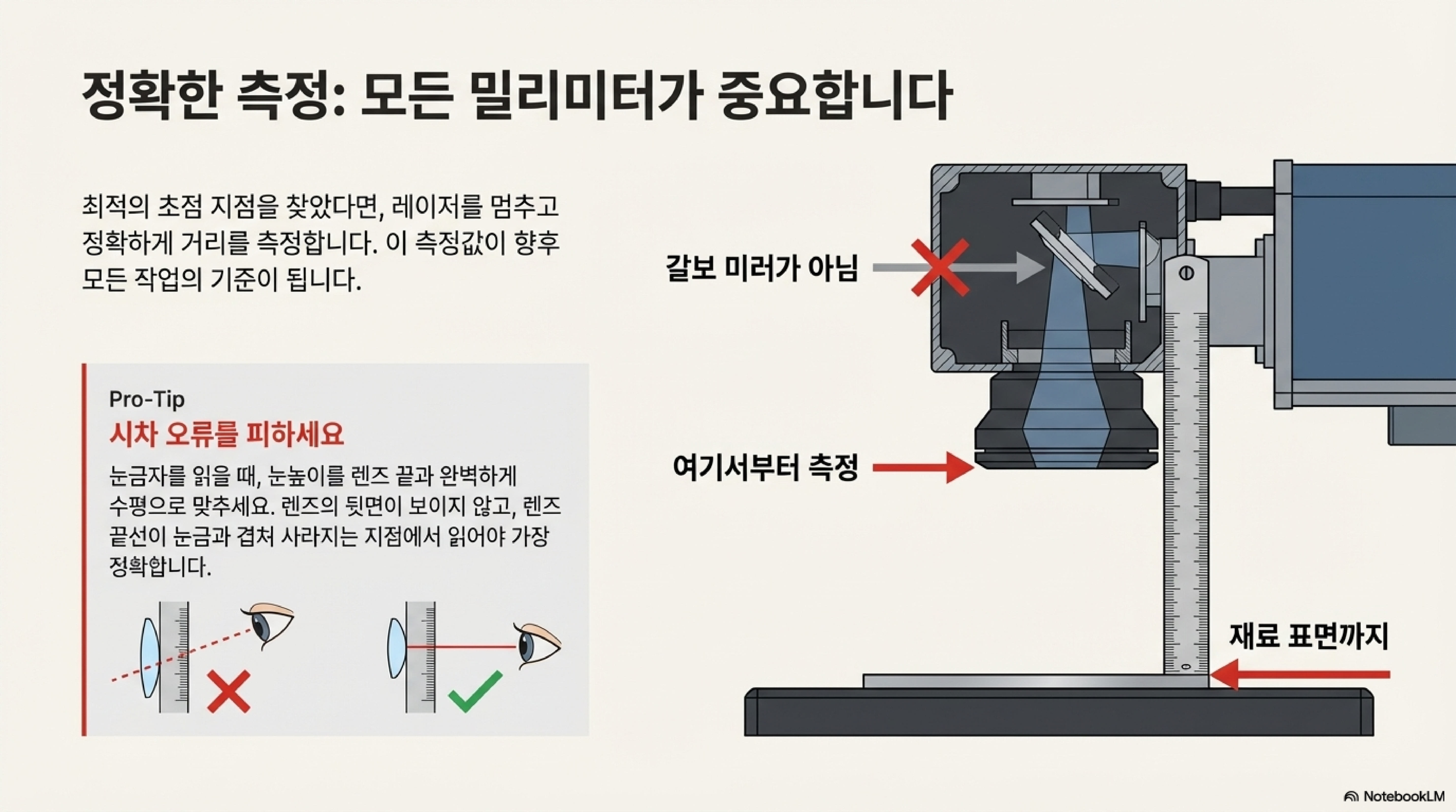 측정 기준점은 매우 명확합니다. 바로 **"렌즈의 가장 아래쪽 테두리(bottom lip)에서 작업물 표면까지의 거리"**입니다. 우리가 만든 초점 스틱이 직접 닿는 부분이 바로 이곳이기 때문입니다. 이것은 복잡한 과학 이론이 아닌 '실용적인 초점 거리'에 대한 이야기입니다. 우리의 목표는 단 하나, '장비와 초점 스틱이 안정적으로 작동하게 만드는 것'뿐이니까요. 복잡한 이론은 잠시 잊고, 이 간단한 원칙만 기억하면 됩니다.