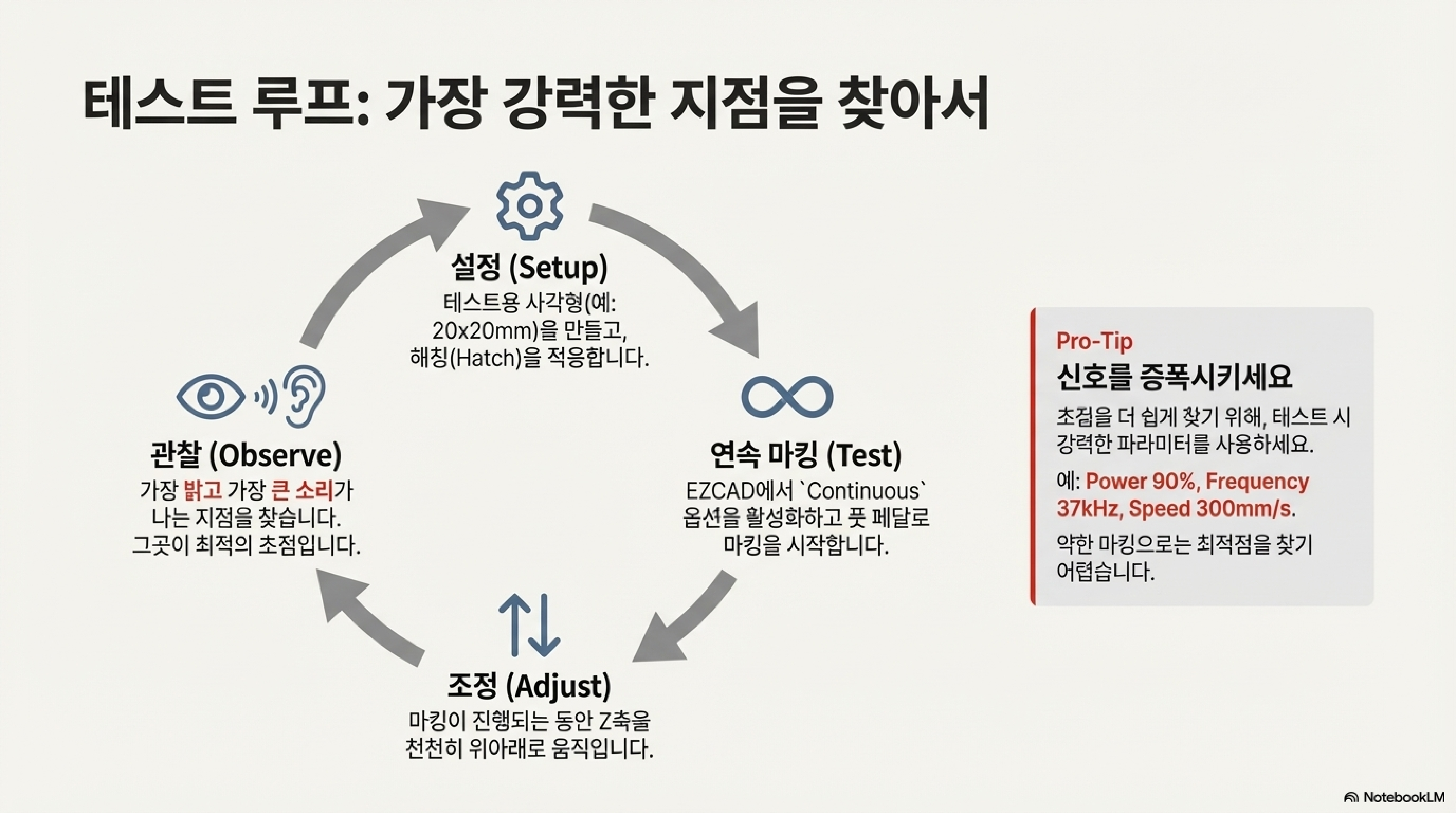 가장 소리가 크고 가장 밝게 빛나는 지점이 바로 그 렌즈의 최적의 초점입니다. 스파크가 가장 강렬하게 튀고, 재료가 타는 소리가 가장 날카롭게 들리는 그 순간을 포착하면 됩니다. 이 감각적인 접근법은 복잡한 계산 없이도 누구나 가장 강력한 레이저 출력을 내는 지점을 직관적으로 찾을 수 있게 해줍니다.