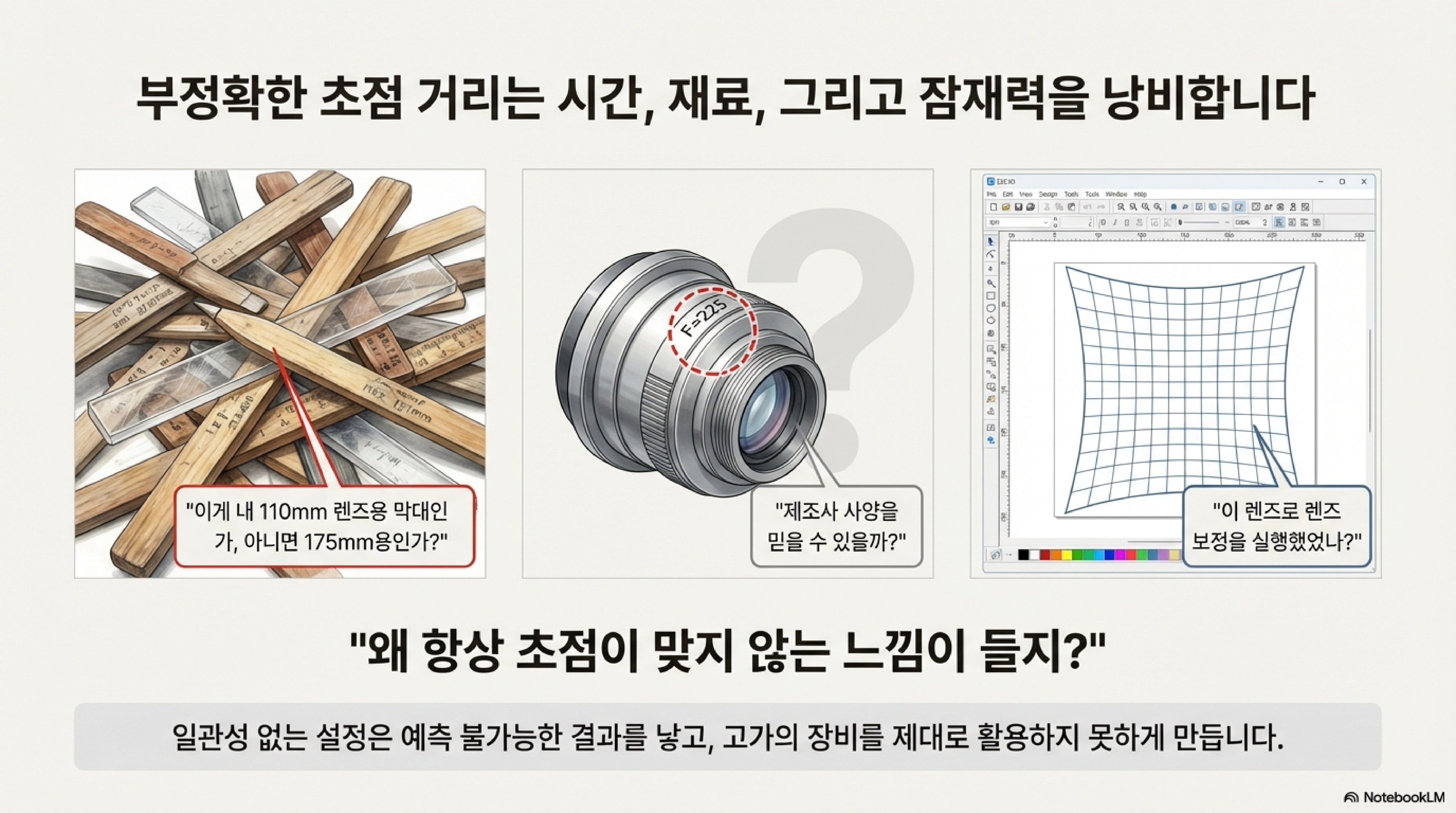 제 작업대 위에는 출처를 알 수 없는 초점 스틱들이 산더미처럼 쌓여 있습니다. 어떤 것이 150mm 렌즈용이었고, 어떤 것이 110mm용이었는지 뒤죽박죽 섞여 알 길이 없습니다. 겨우 맞는 스틱을 찾아 작업을 시작해도 결과물은 어딘가 만족스럽지 않습니다. 이런 혼란스럽고 비효율적인 상황, 더는 용납할 수 없습니다. 오늘은 당신의 레이저 장비가 가진 잠재력을 100% 끌어내는, 제조사도 알려주지 않는 초점 거리에 대한 놀라운 진실 5가지를 알려드리겠습니다.