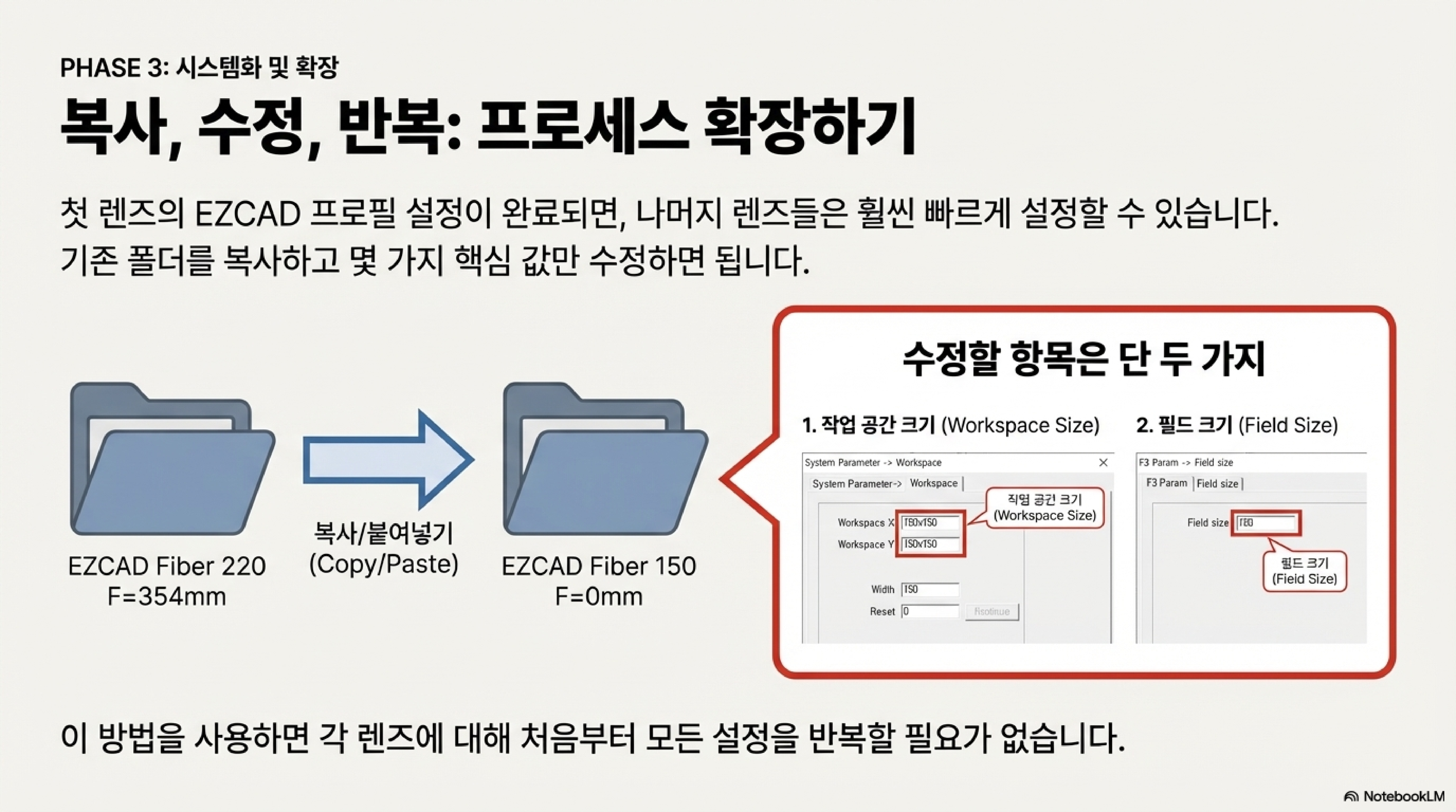 - 먼저, 기준이 될 렌즈(예: 가장 큰 렌즈)의 EZCAD 설정 폴더 하나를 완벽하게 구성합니다.