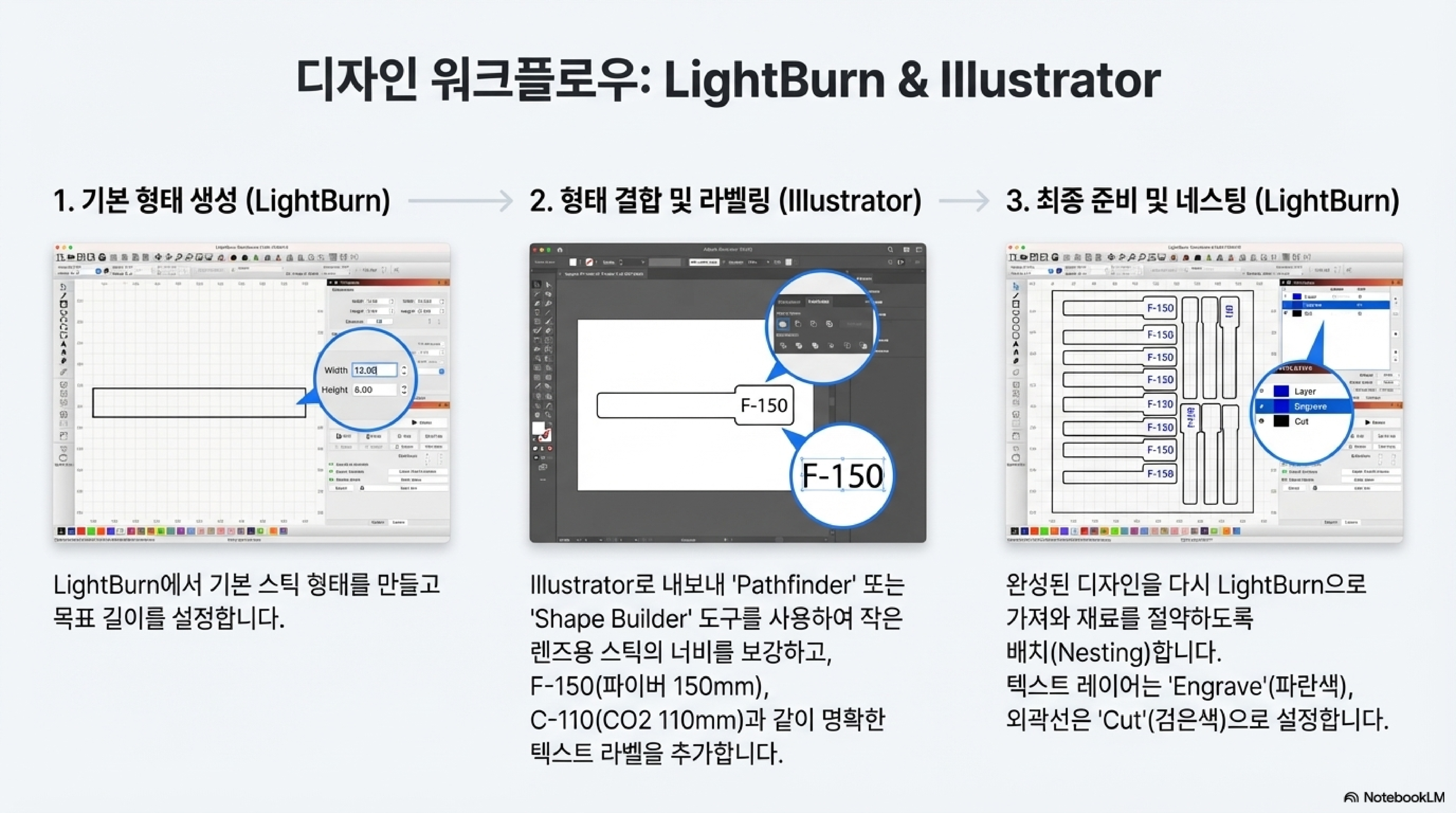 영상 진행자는 LightBurn 소프트웨어에서 도형들을 합치는 'Weld(용접)' 기능을 시도합니다. 하지만 기능이 예상대로 작동하지 않자, 그는 단 1초의 망설임도 없이 외칩니다. "그냥 일러스트레이터에서 하죠." 그리고는 곧바로 파일을 내보내 Adobe Illustrator에서 'Unite(합치기)' 기능으로 문제를 해결합니다.