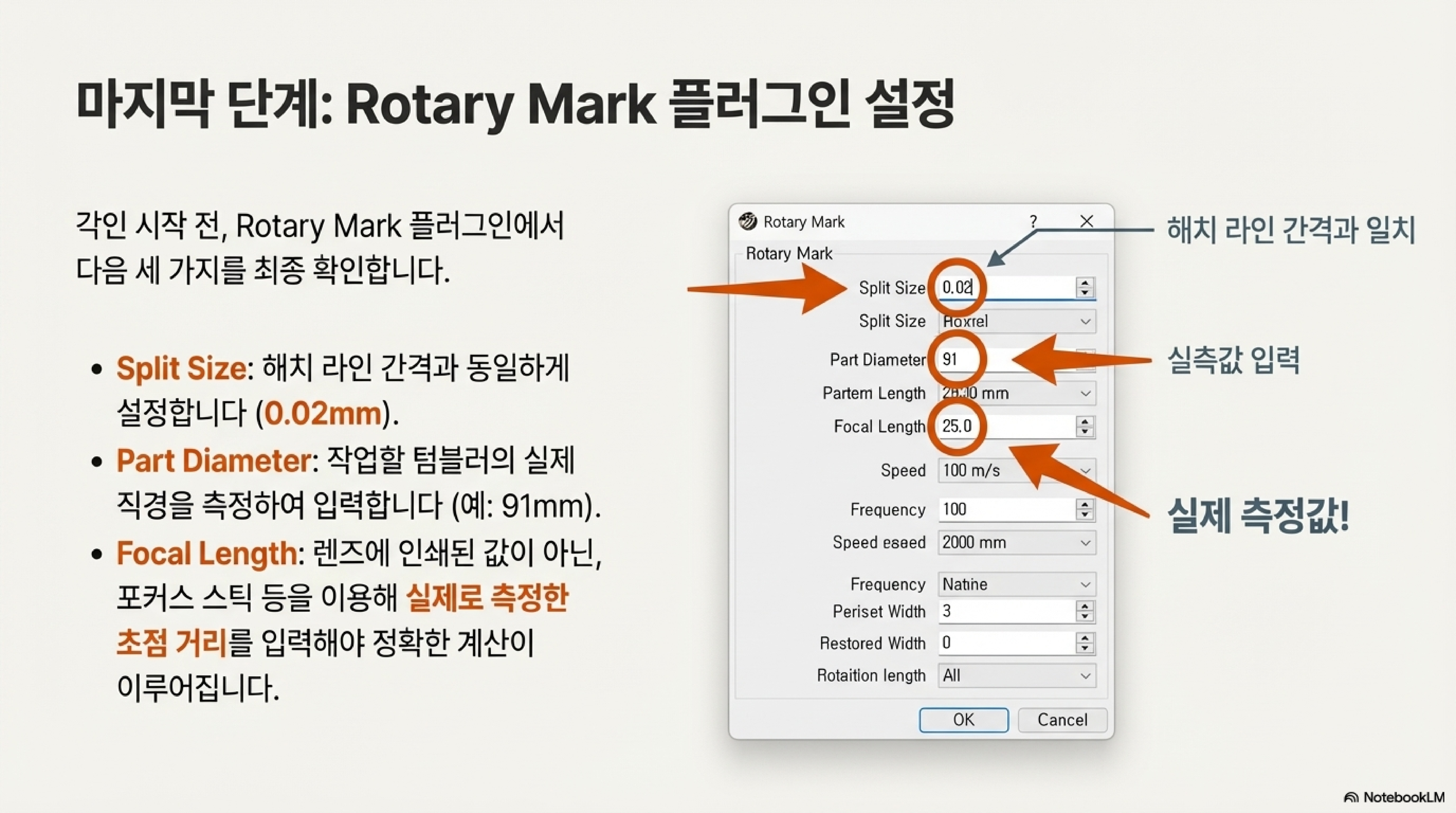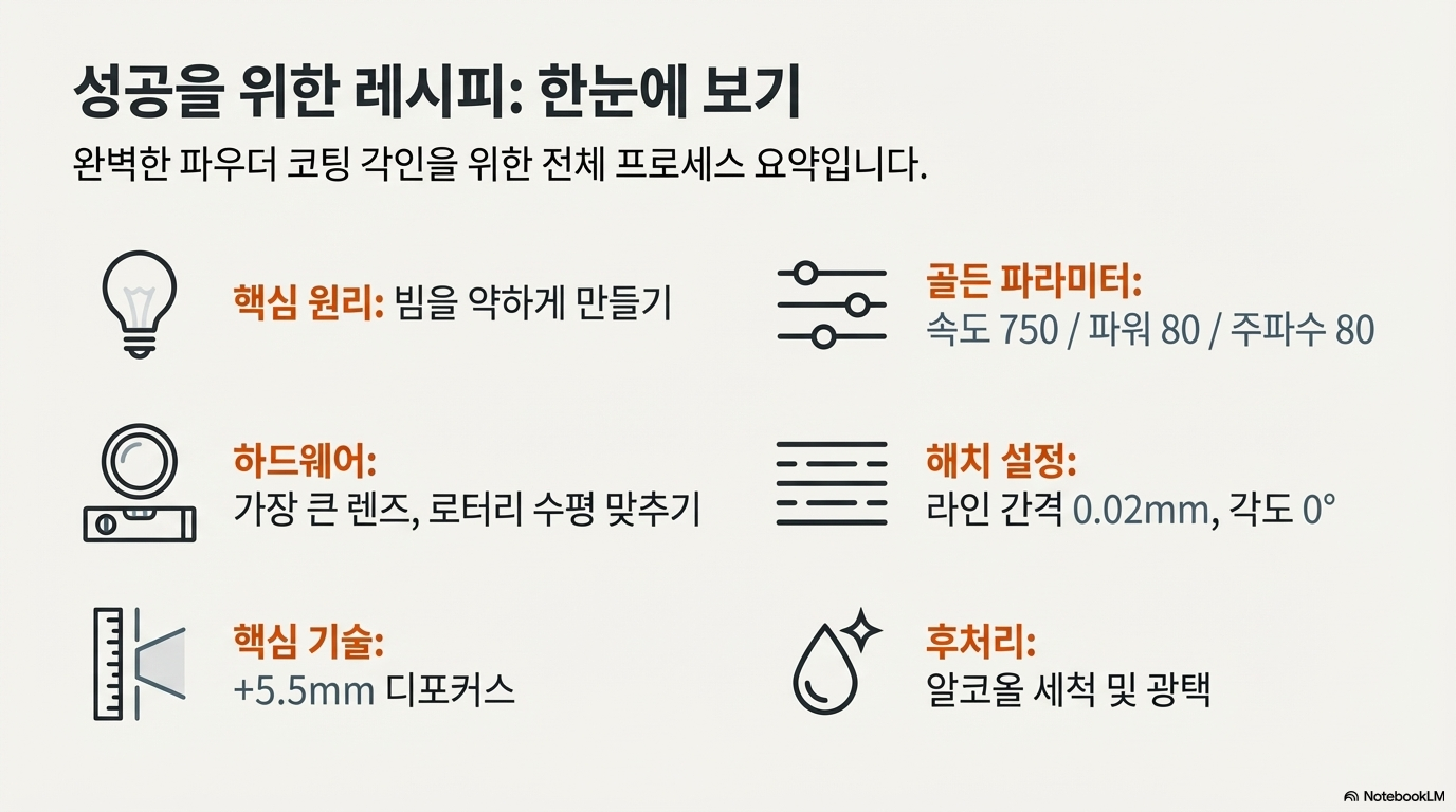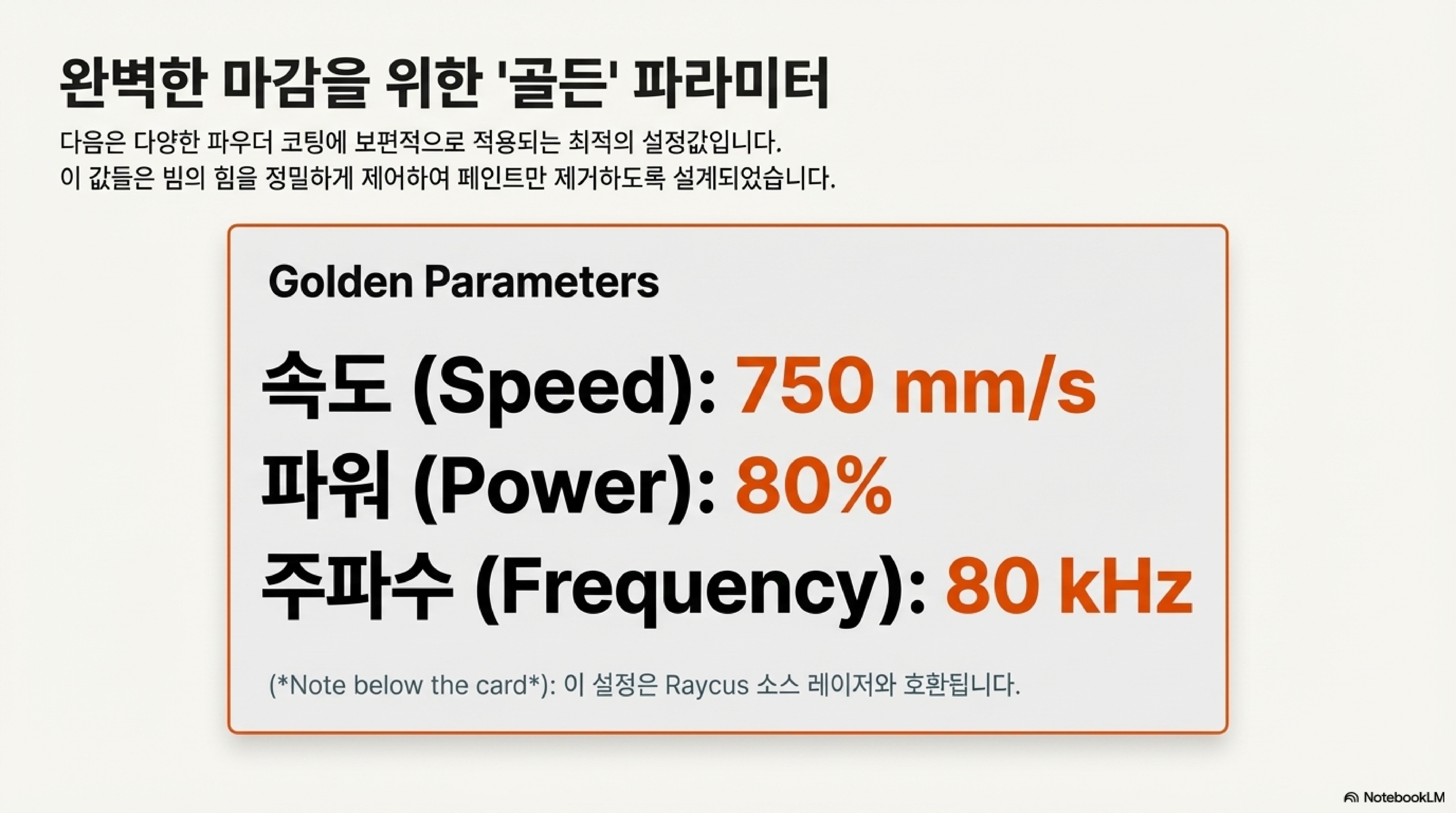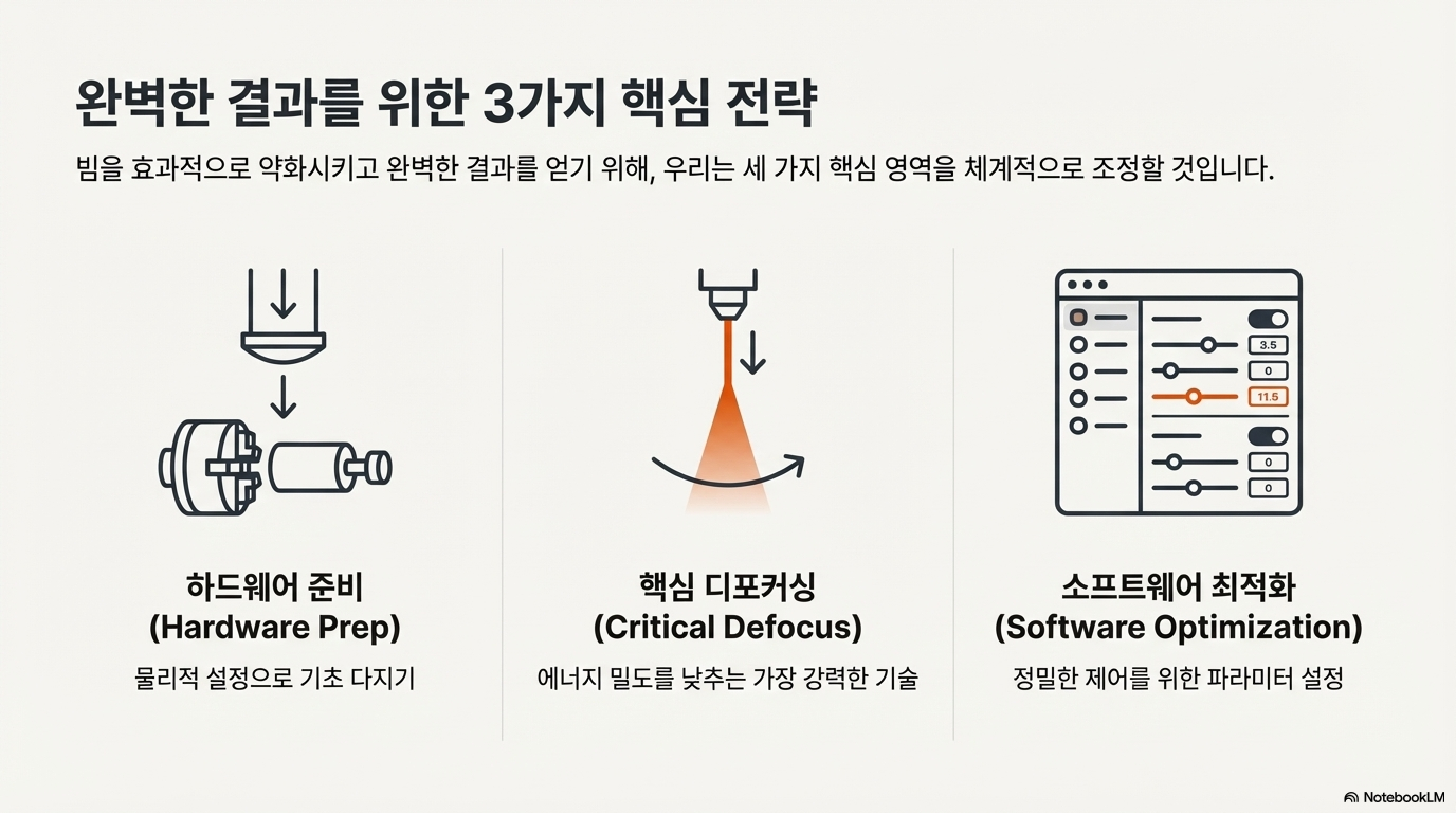 이것이 효과적인 이유는 간단합니다. 초점을 흐리면 레이저의 도트(dot) 크기가 커집니다. 동일한 출력이 더 넓은 영역에 분산되면서 단위 면적당 에너지 밀도가 낮아지게 됩니다. 이는 미세 조정이 아닌, 원하는 결과를 얻기 위한 필수적이고 과감한 조정입니다.