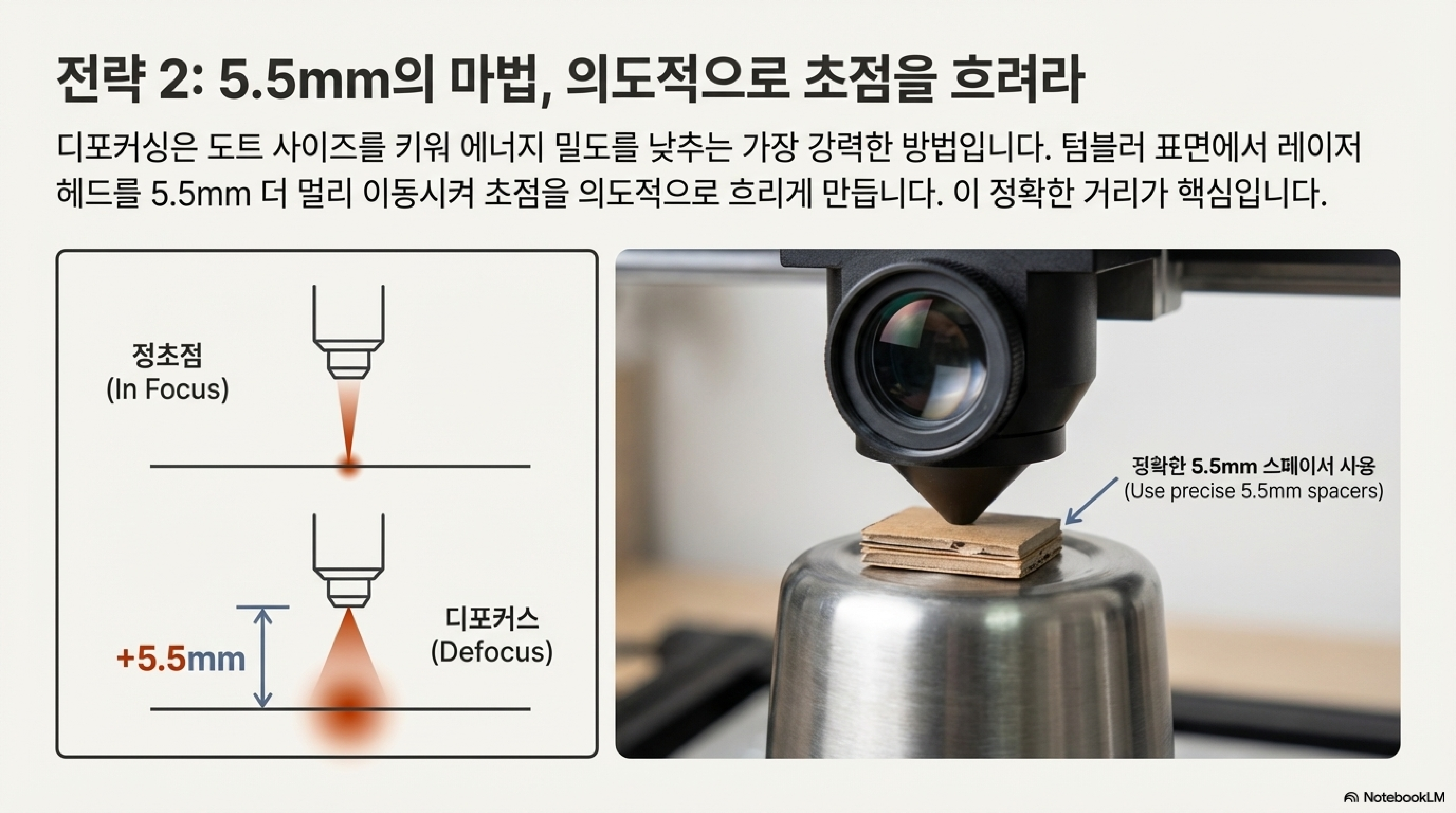 빔을 약화시키는 가장 중요한 기술 중 하나는 바로 '초점 흐리기(Defocusing)'입니다. 단순히 초점을 약간 벗어나는 것이 아니라, 의도적으로 상당한 거리를 두는 것입니다. 튜토리얼에서는 텀블러 표면을 기준으로 초점을 5.5mm 더 멀리(away from the cup) 설정했습니다. 즉, 초점 거리가 텀블러 표면보다 5.5mm 더 길어지도록 조절하는 것입니다.
